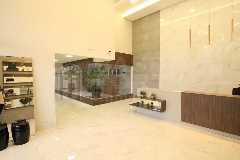 Hall de entrada decorado, com piso em granito
