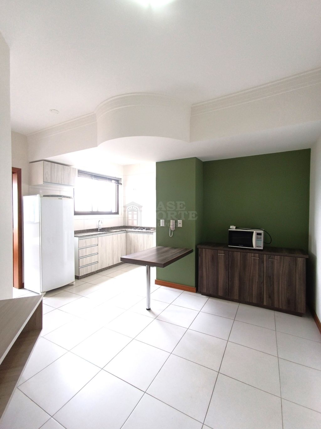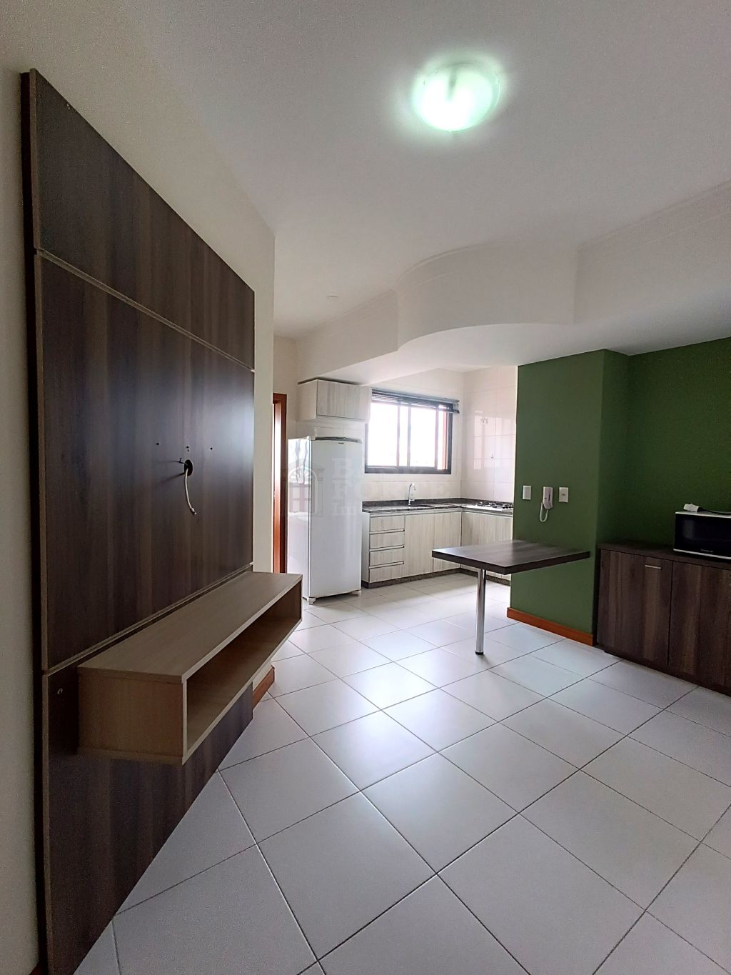 Apartamento semi-mobiliado, contendo 1 quarto, sala, cozinha e área de serviço integrada, bwc social e garagem.
