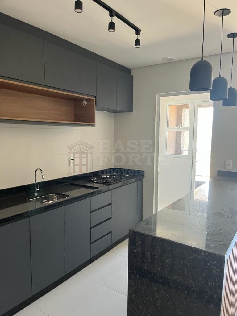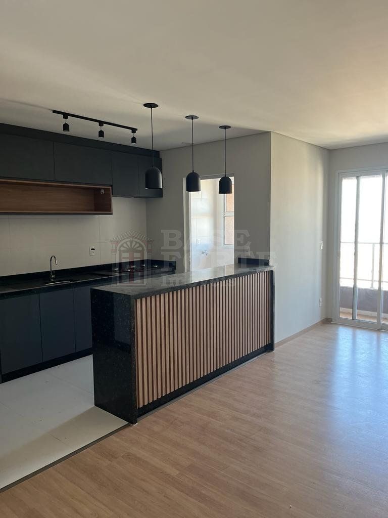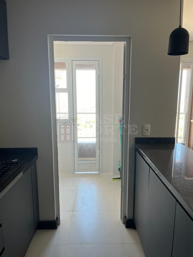 Apartamento, contendo 2 quartos (sendo uma suíte), sala de estar e jantar integradas, cozinha (com armários), banheiro social, área de serviço, área gourmet com churrasqueira e uma vaga de garagem.