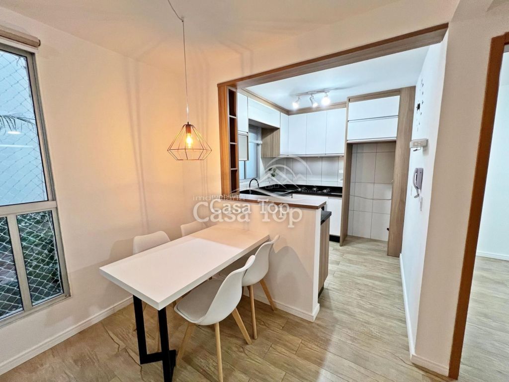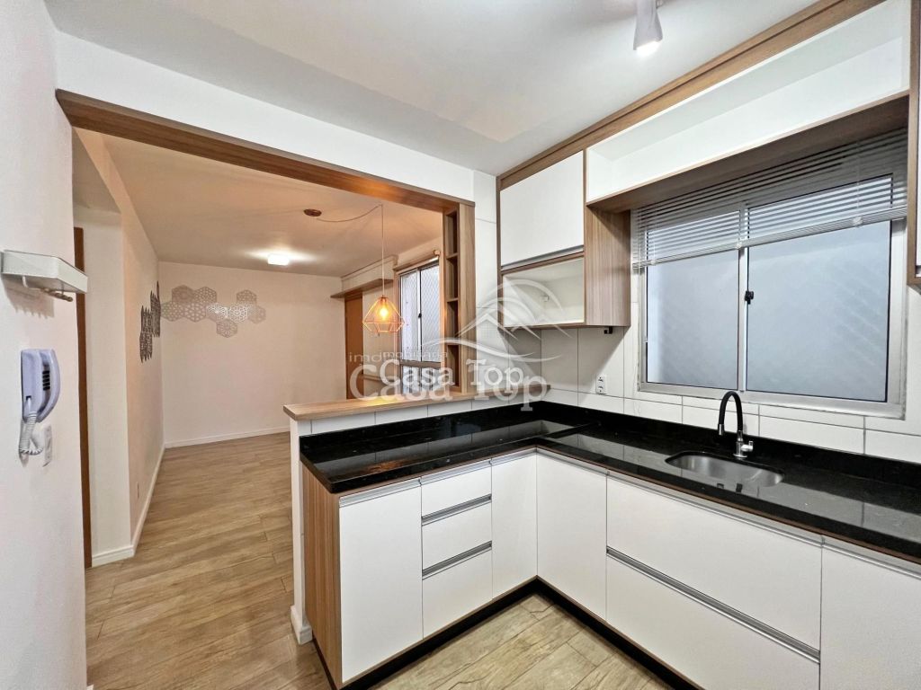 Apartamento térreo semimobiliado no Condomínio Parque Purunã medindo aprox. 65m², contendo 2 quartos, sala para 2 ambientes, cozinha com armários, área de serviço, BWC social e 1 vaga de estacionamento.