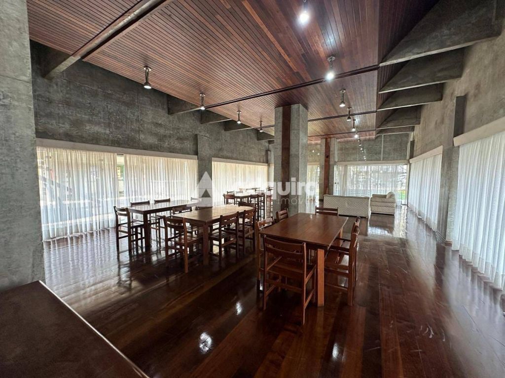 Salão de festas: Espaço elegante com arquitetura que combina concreto aparente e madeira de lei.