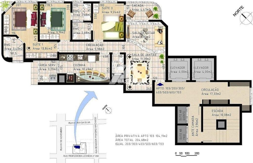 Espaço Privativo Inteligente: São 104,11m² de área privativa (204,68m² de área total), distribuídos de forma a separar perfeitamente a área social da íntima.