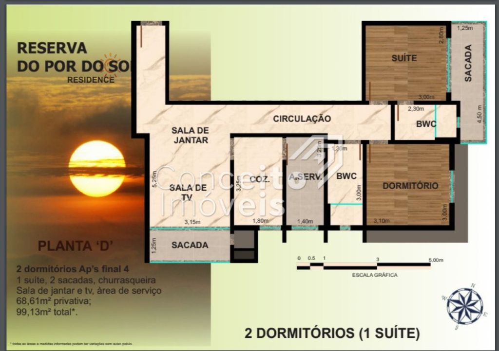 Edifício Reserva Por do Sol - Apartamentos em fase de obra com 03 dormitórios sendo destes uma suíte, 2 sacadas, churrasqueira, sala de jantar e tv integradas, área de serviço e cozinha em conceito aberto. Medindo 100,57m² privativos e 131,09m² de área total.