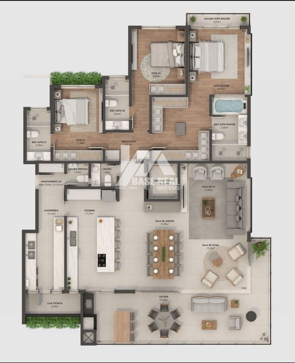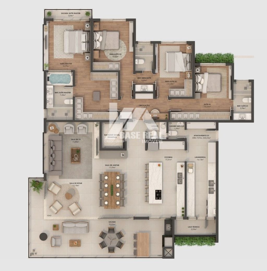 Planta Final 1 242 m², com 2 suítes, 2 demi-suítes e 3 vagas de garagem.