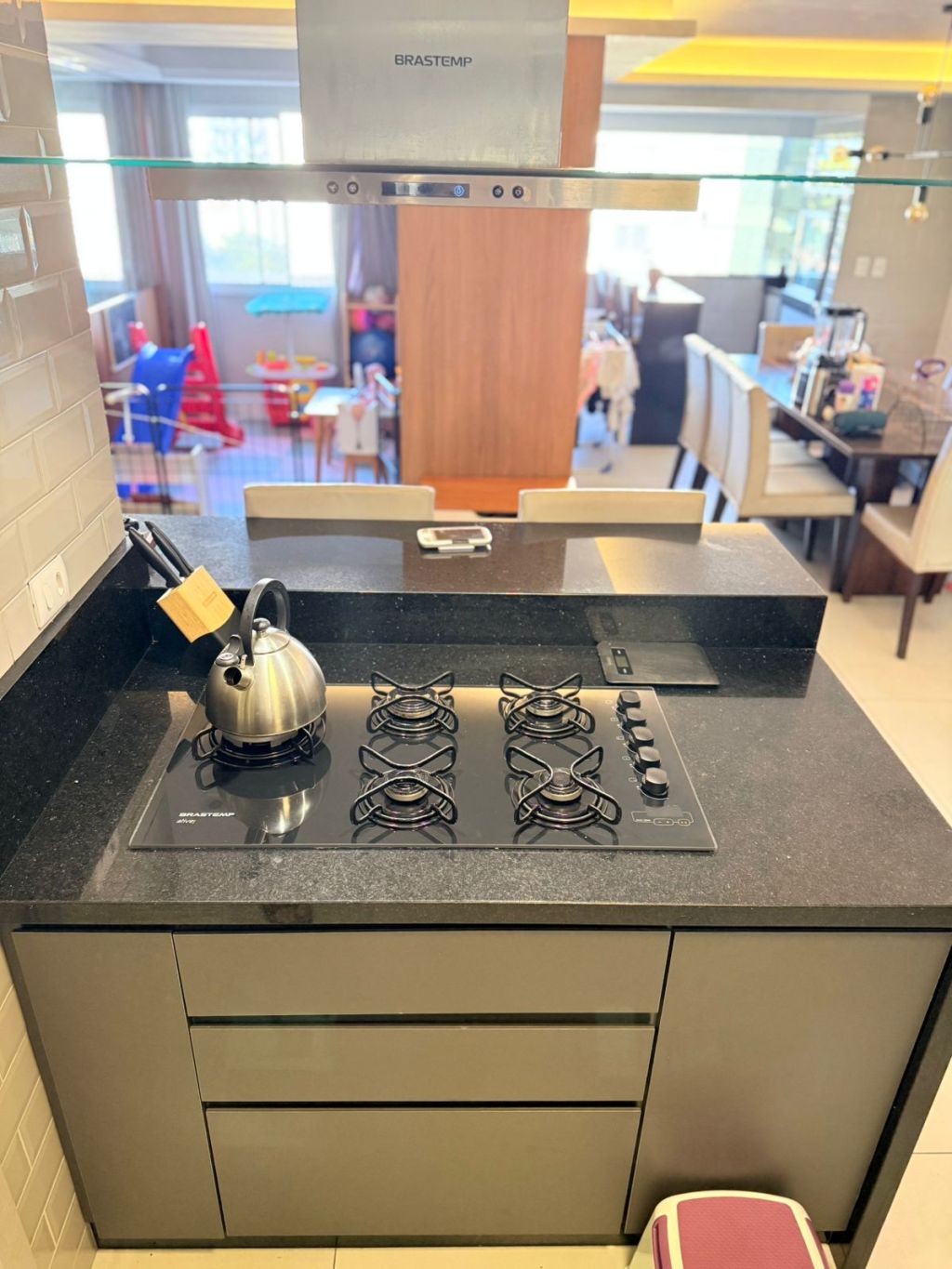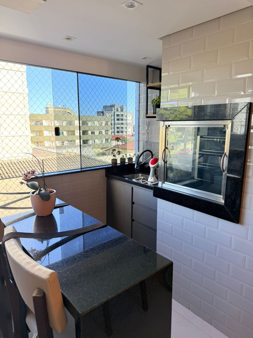 Cozinha em conceito aberto com sala de jantar, estar, churrasqueira integrada ao ambiente e sacada.