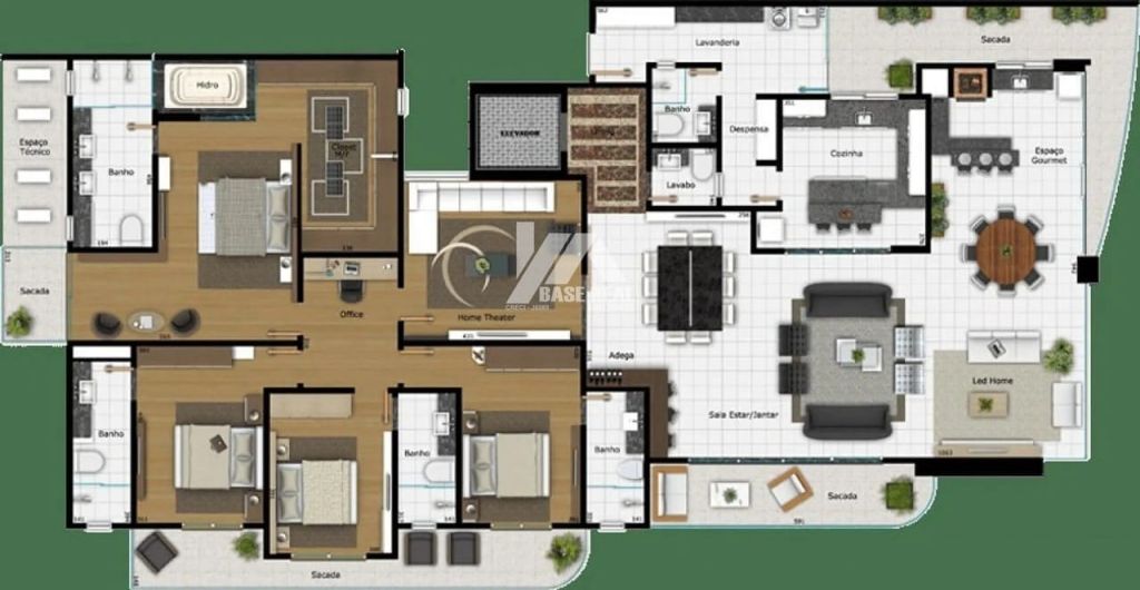 Apartamento andar alto, contendo 4 suítes (sendo uma suíte master com hidromassagem, closet feminino e masculino), sala de home Theater íntimo, ampla sala de estar e sala de jantar com sacada, espaço gourmet e LED home integrados, lavado, cozinha, despensa e banheiro de serviço.