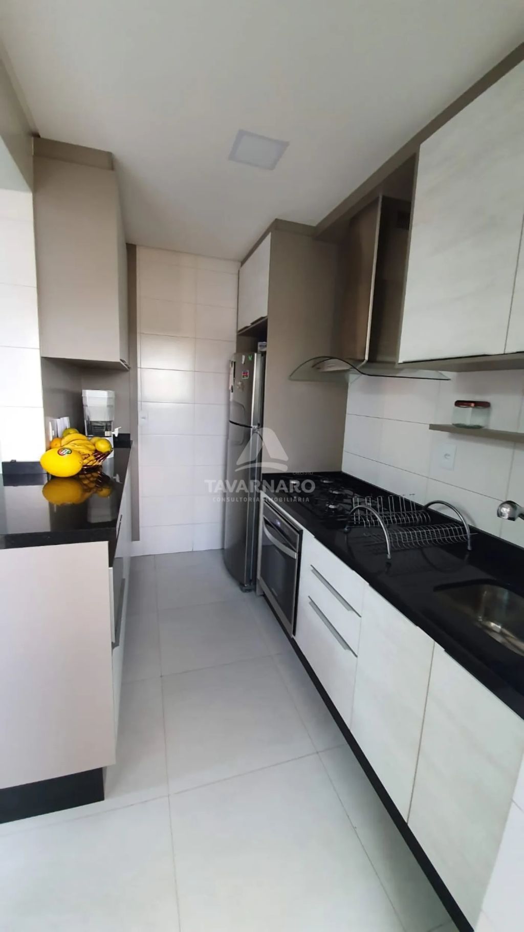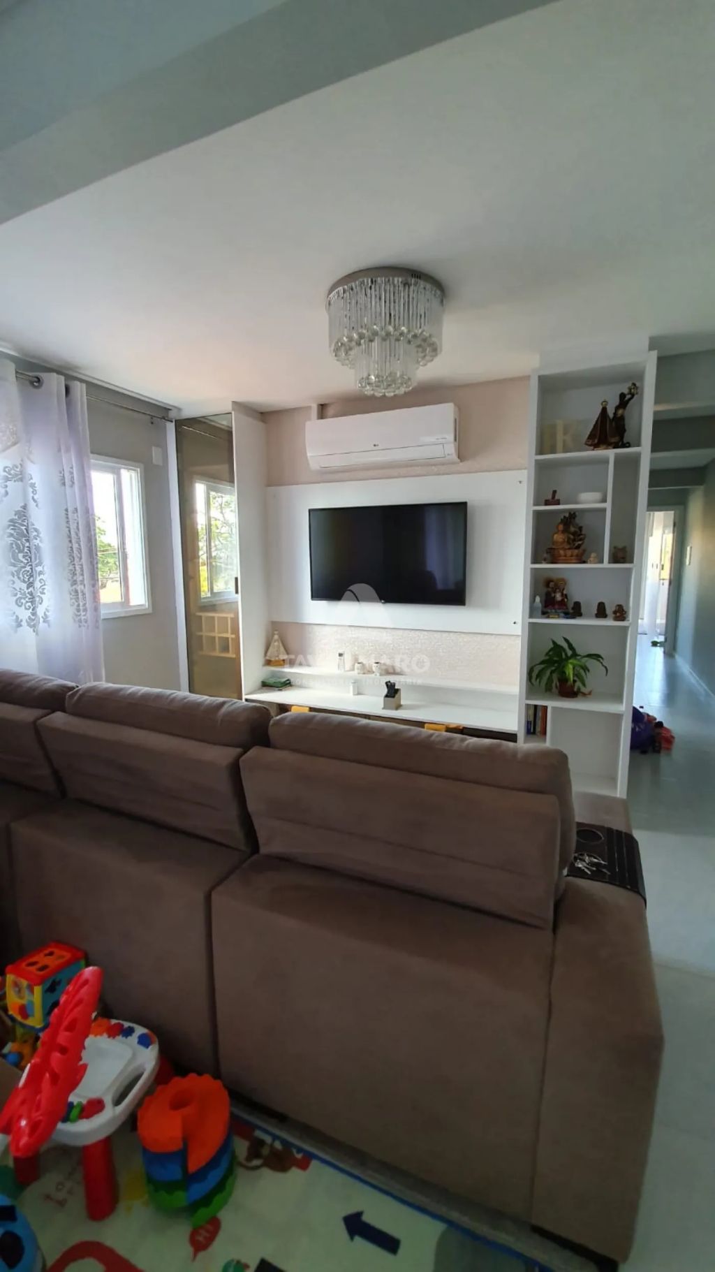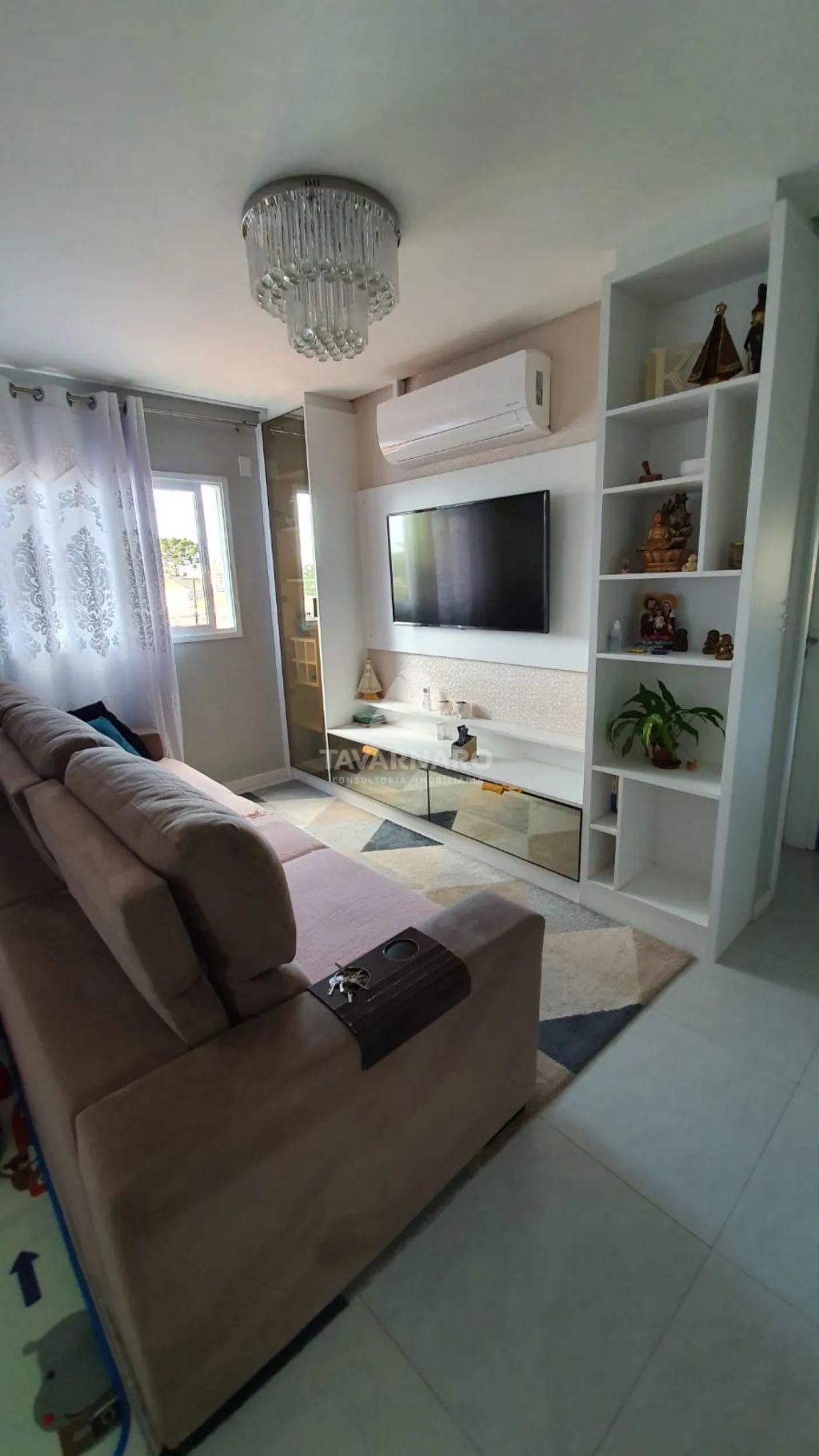 A cozinha é totalmente personalizada, oferecendo praticidade e modernidade. A sala de estar possui um sofá, rack e painel para tv planejados, criando um espaço aconchegante e bem distribuído.