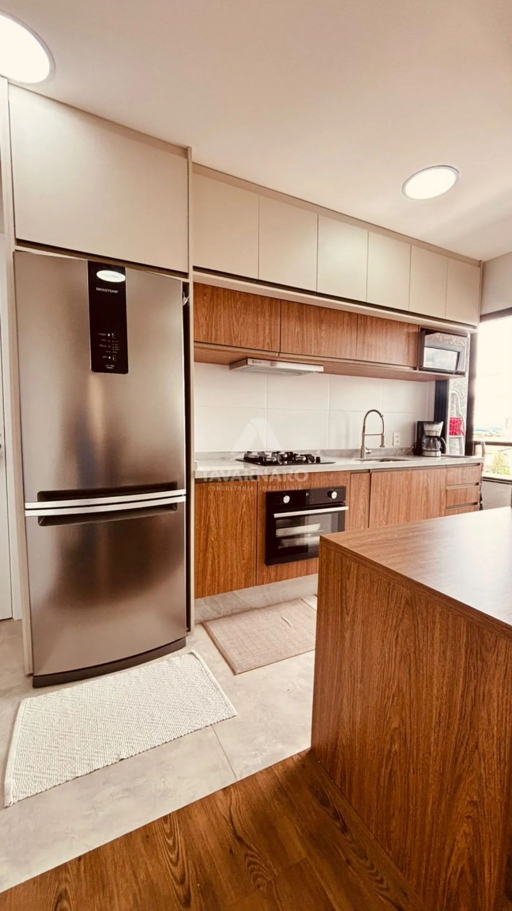 A cozinha é totalmente planejada, com móveis sob medida que unem funcionalidade e elegância. Os banheiros também são planejados, trazendo organização e um acabamento moderno.