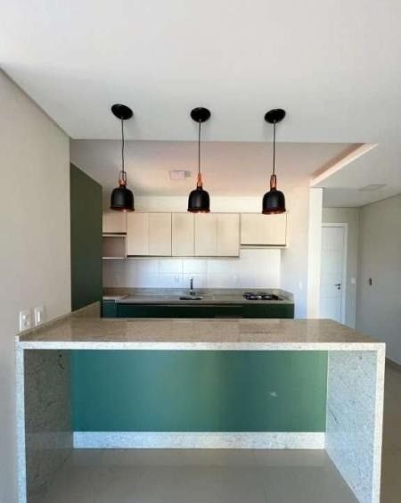 Piso inferior: Dois quartos sendo uma suíte com closet já planejado, sala para dois ambientes com sacada, cozinha com cuba e armários, área de serviço e banheiro social