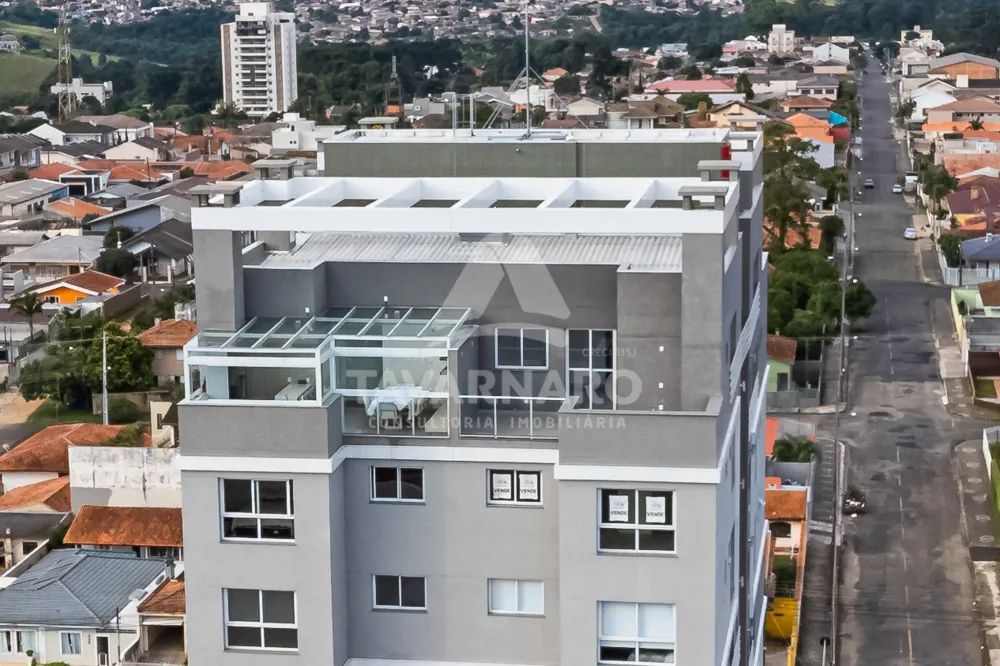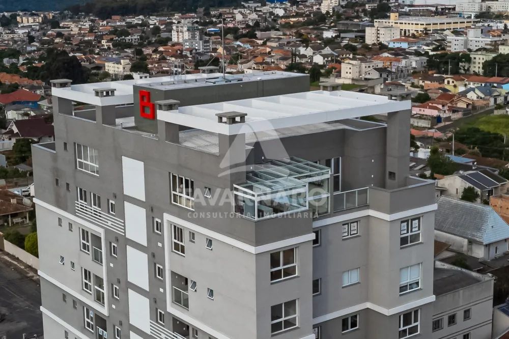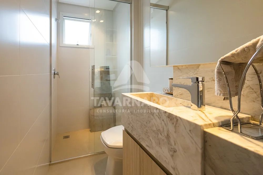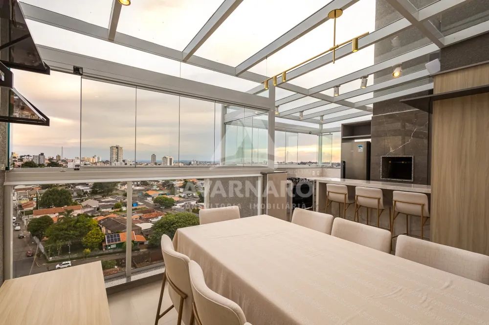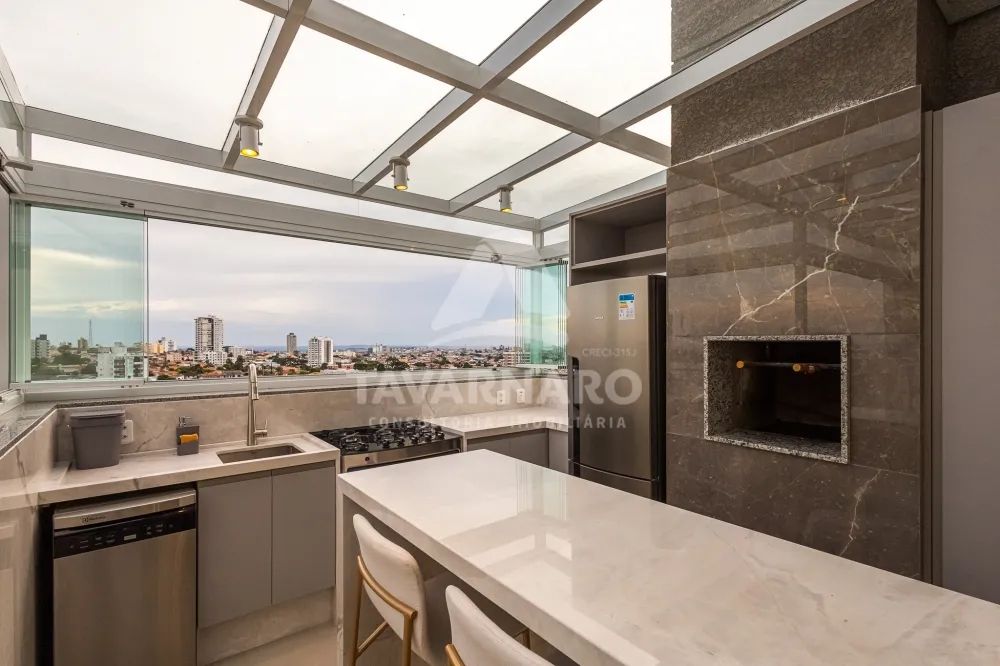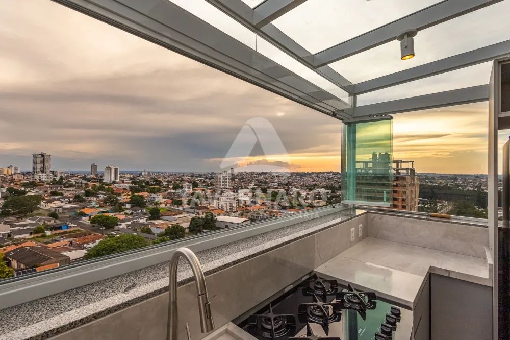 A cobertura é fechada em vidro com abertura total nas laterais e há 2 vagas de garagem.