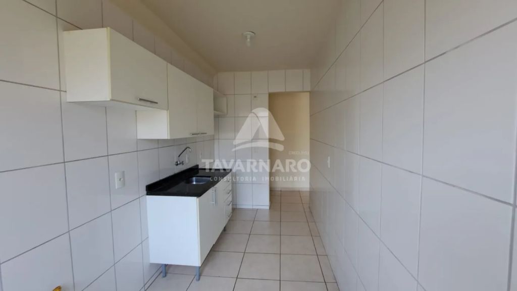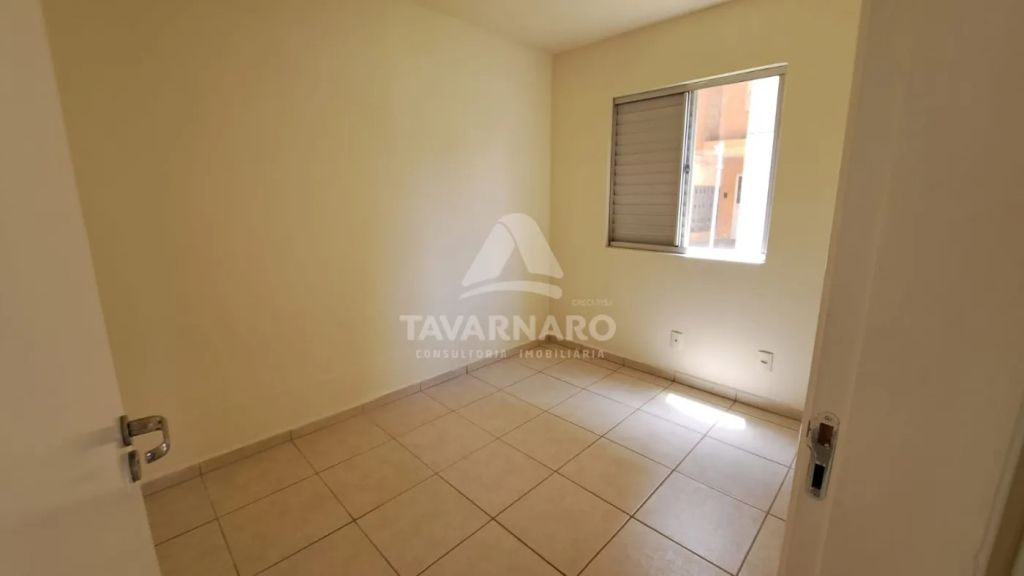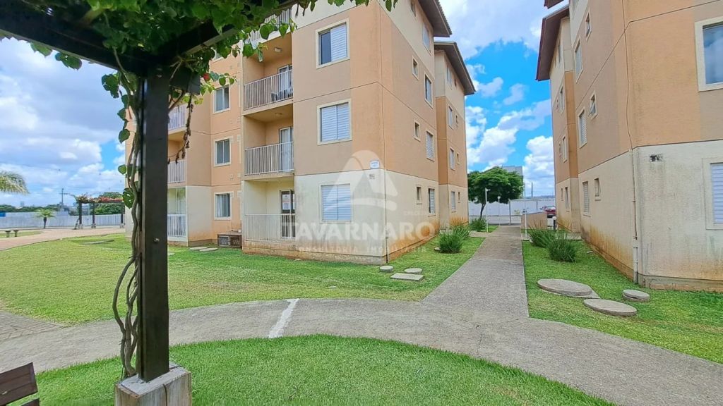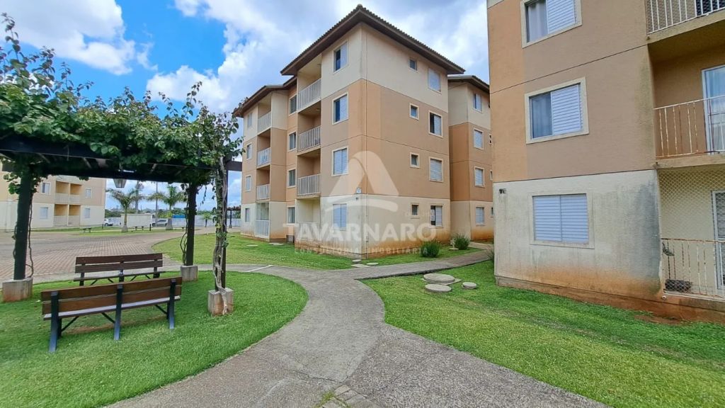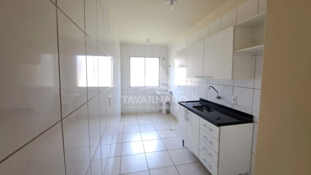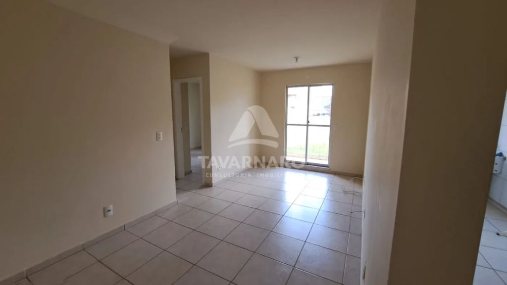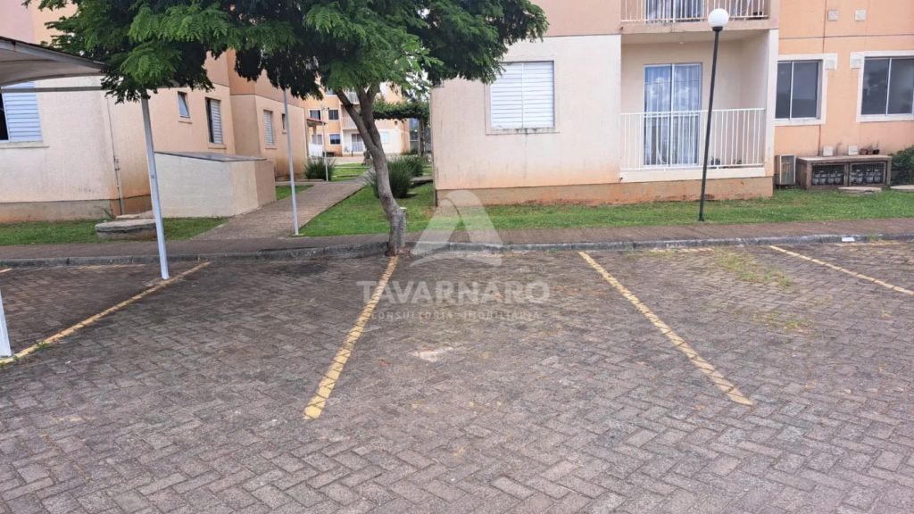 Apto térreo com 2 dormitórios, sala para 2 ambientes com sacada, cozinha com armários, área de serviço, banheiro social e uma vaga de estacionamento.