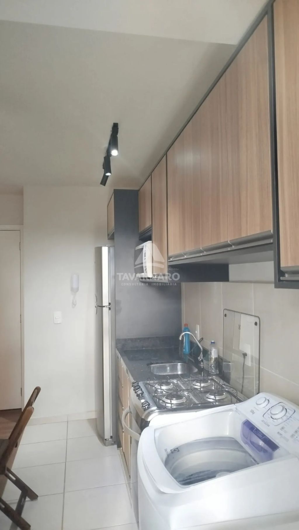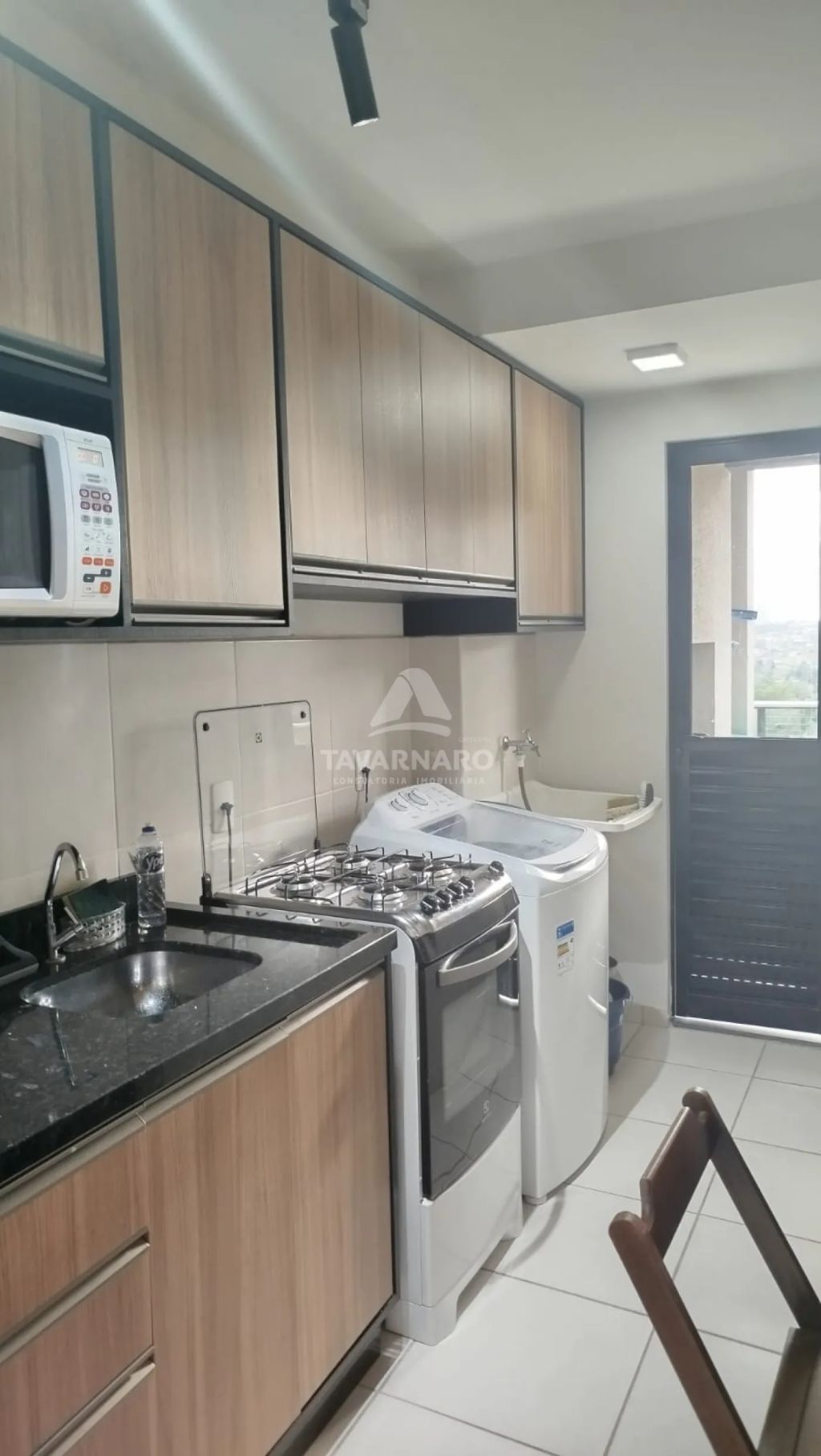 O imóvel possui dois quartos com cama box de casal, sala equipada com sofá e rack, cozinha com móveis planejados, fogão e micro-ondas, banheiro social com box de vidro e lavanderia com lavadora de roupa e tanque.