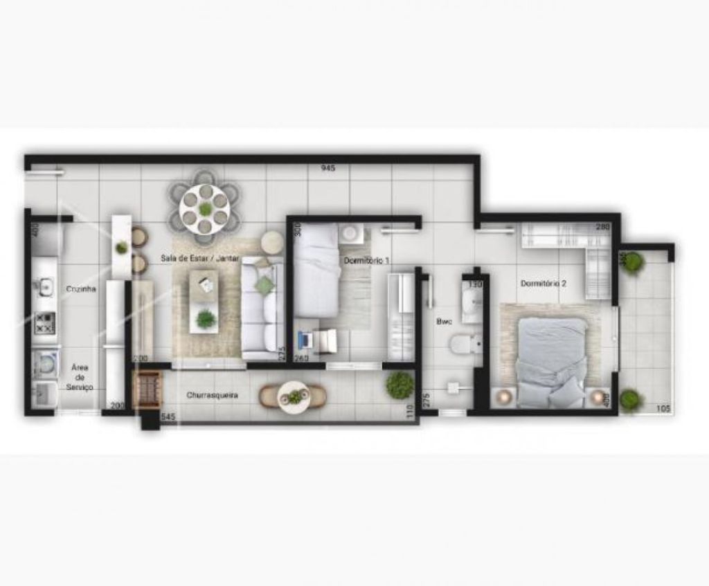 Disposto em 2 dormitórios, cozinha com área de serviço, sala, banheiro social e sacada com churrasqueira.