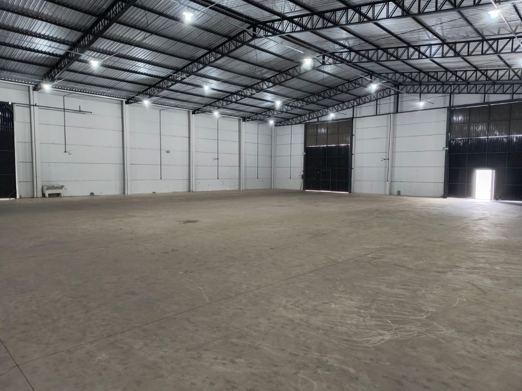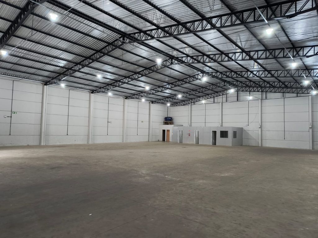 Um amplo barracão comercial com piso reforçado contendo 02 escritórios, 02 banheiros e 03 portões de entrada sendo 02 basculantes.
