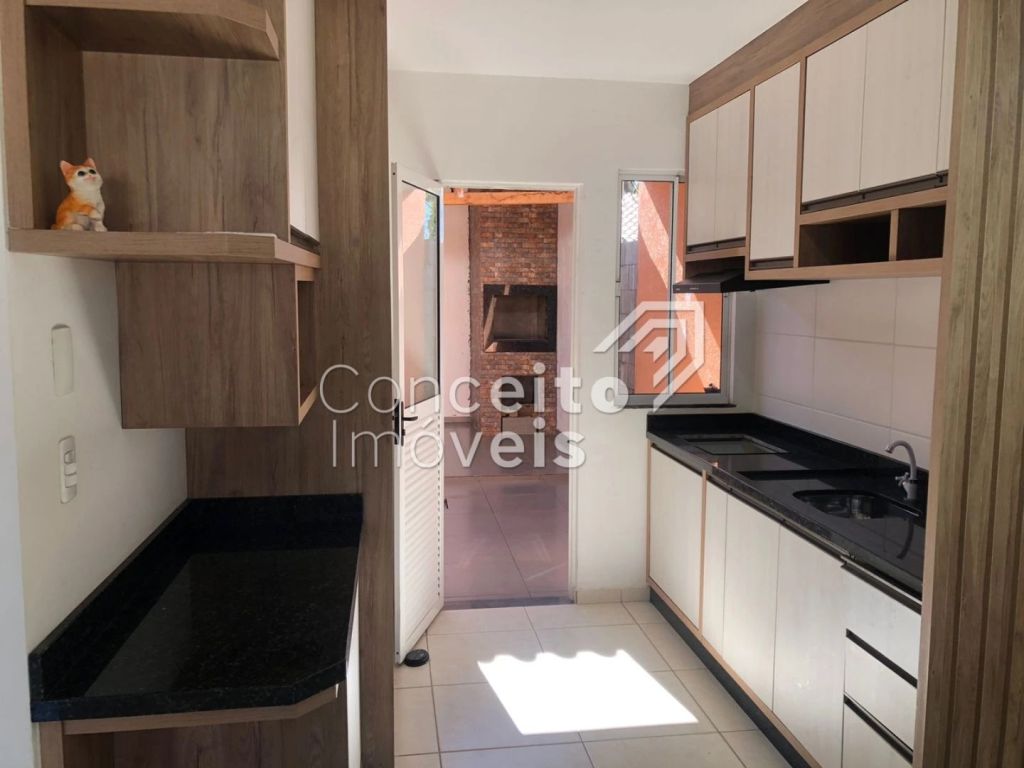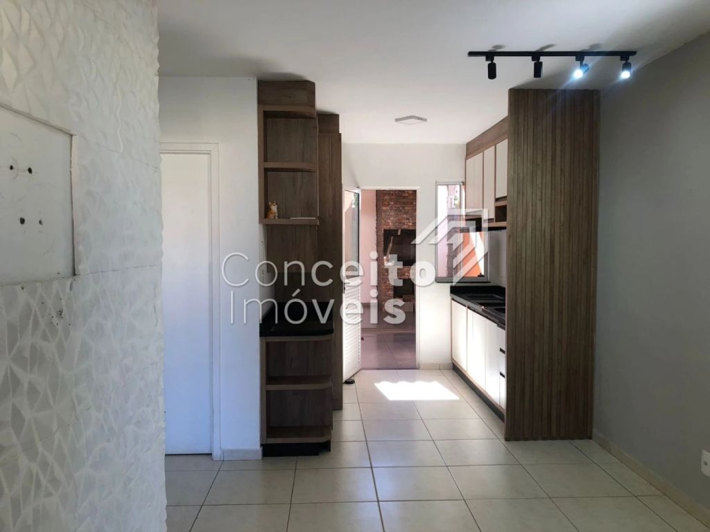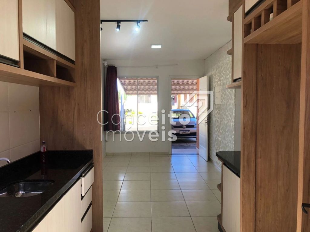 Casa com 82m² de área total com 2 quartos sendo um deles com ar condicionado, 1 banheiro social com box e chuveiro, sala para dois ambientes, cozinha com móveis planejados, edícula aberta com churrasqueira e 2 vagas de garagens, sendo uma coberta e uma descoberta.