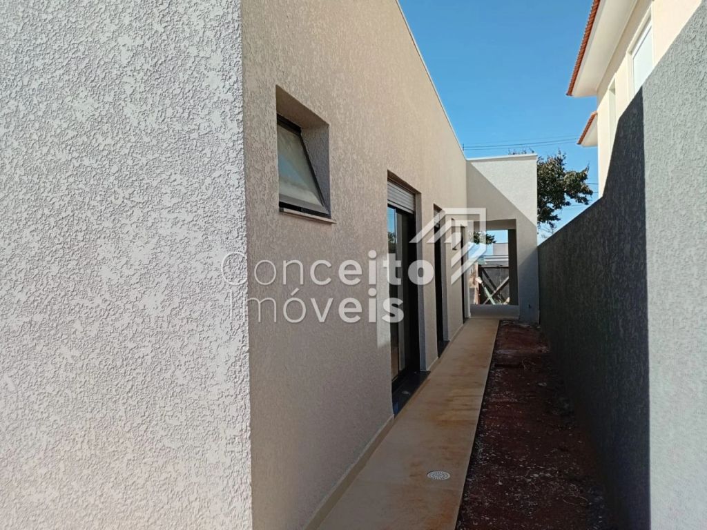 Sobre o imóvel, são 3 quartos, sendo um deles com suíte e closet; living integrado com pé direito duplo que proporciona amplitude e luminosidade; 1 sala; 1 cozinha, 1 banheiro social. Vaga de garagem coberta para dois veículos, além de lavanderia ao lado externo. Detalhe do imóvel são as passagens laterais em torno do mesmo.