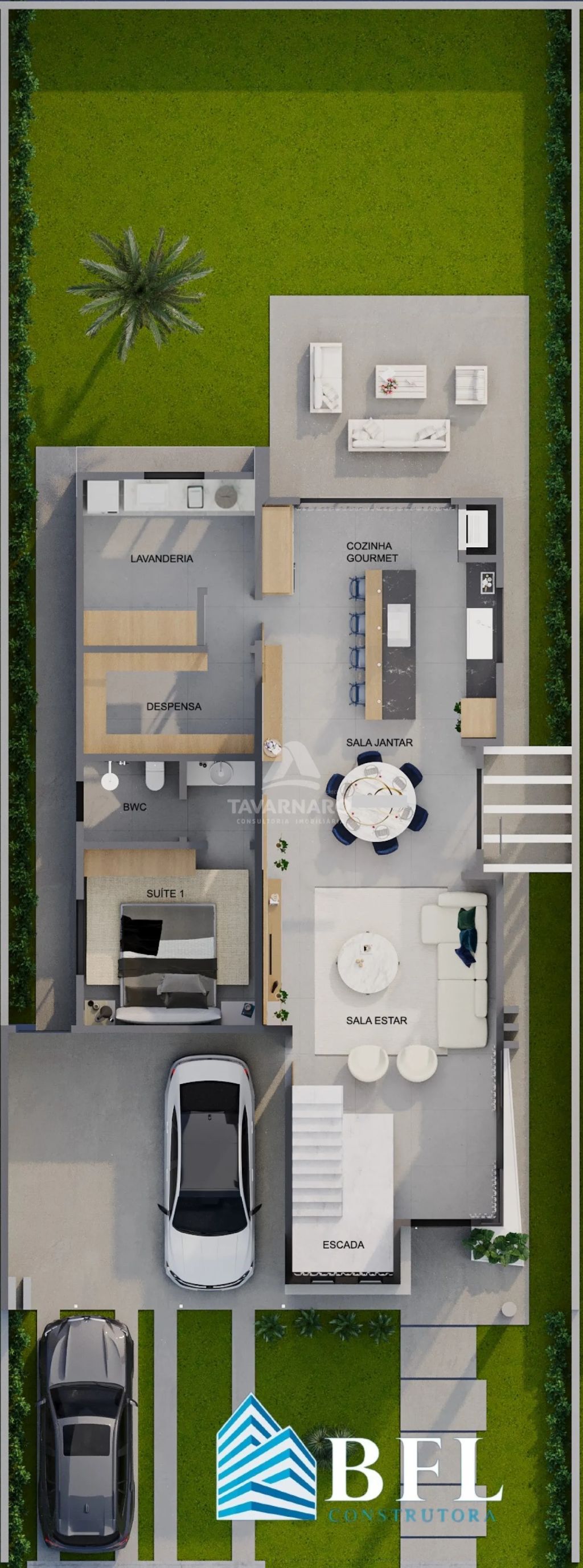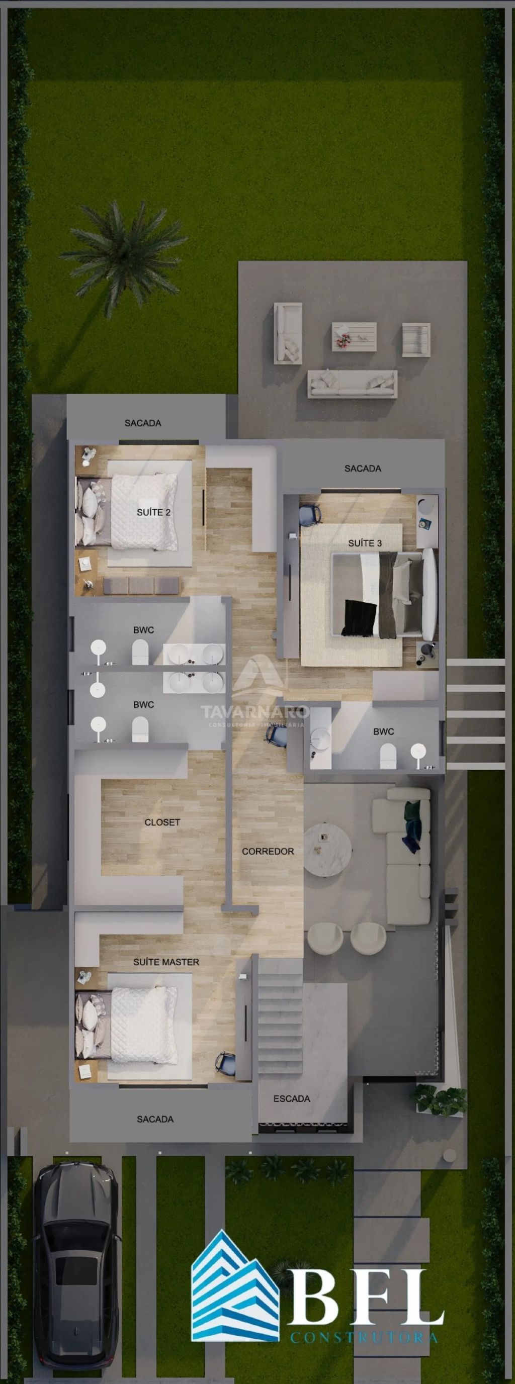 São 262,17m² de área total, distribuídos em 4 quartos, sendo 03 suítes (suíte master com closet), e 1 quarto localizado no piso inferior;