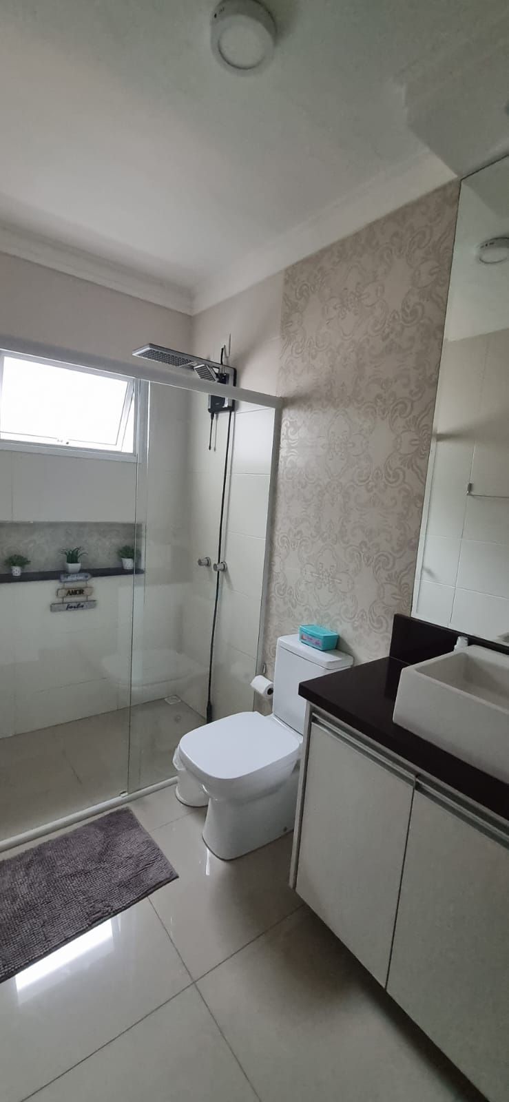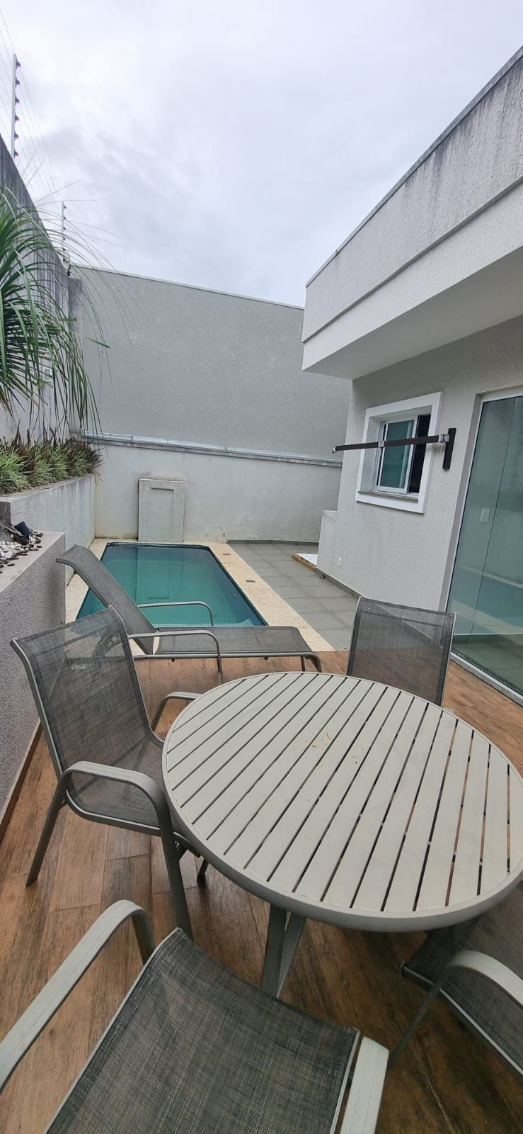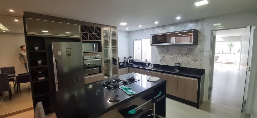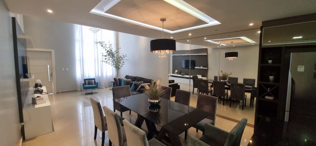 Possui 03 quartos mobiliados, sendo 01 deles 01 suíte master e um banheiro, sala com pé direito duplo totalmente mobiliada integrada à cozinha com móveis planejados e eletrodomésticos e lavabo. Churrasqueira anexada à lavanderia e a uma piscina aquecida com cascata.