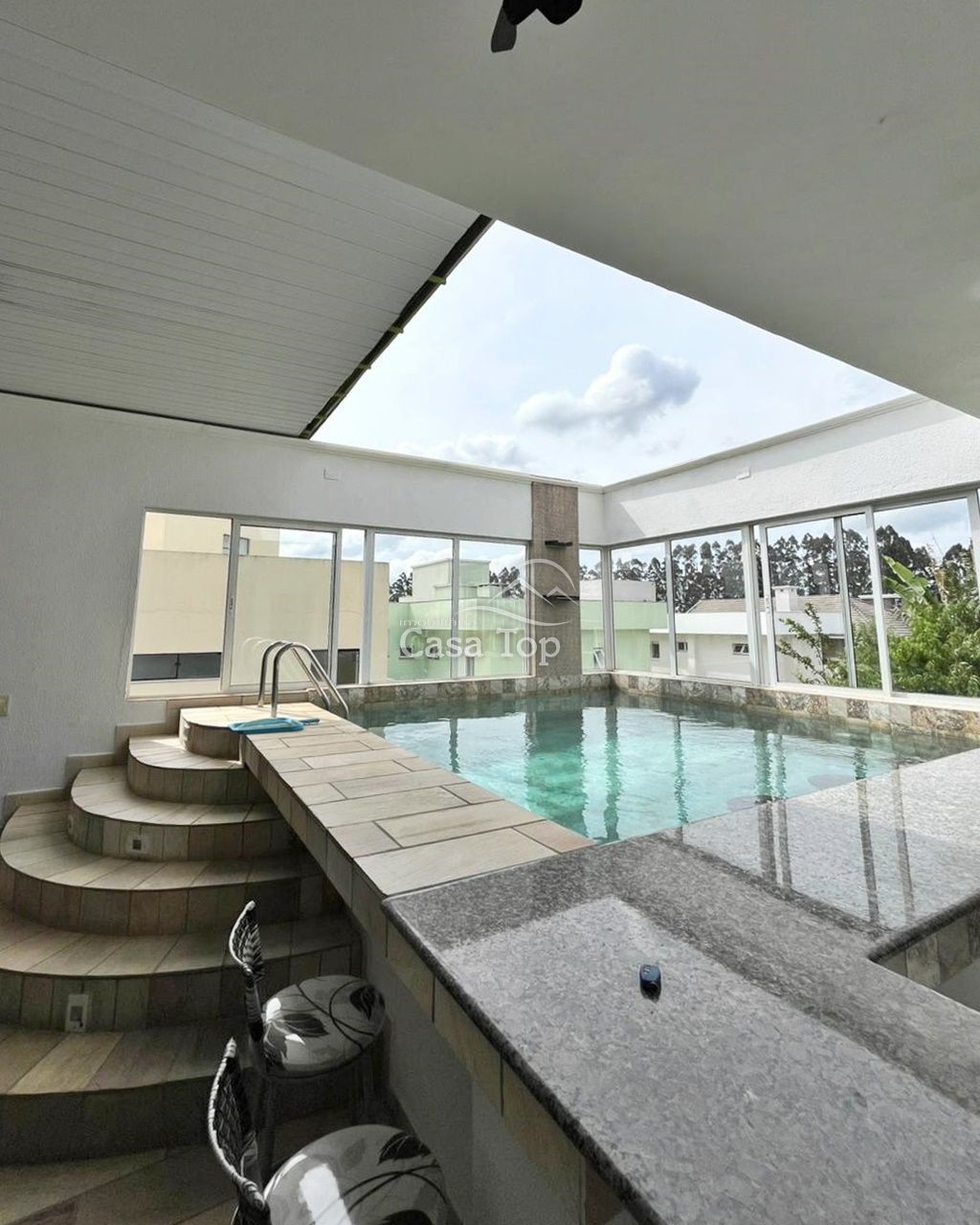 Residência semimobiliada medindo aprox. 350m², 4 quartos (sendo 3 suítes com hidromassagem), sala de estar com lareira, sala de jantar, sala íntima com lareira, cozinha, churrasqueira, piscina interna com teto retrátil, sauna, àrea de serviço, lavabo, BWC social e 4 vagas de garagem coberta.