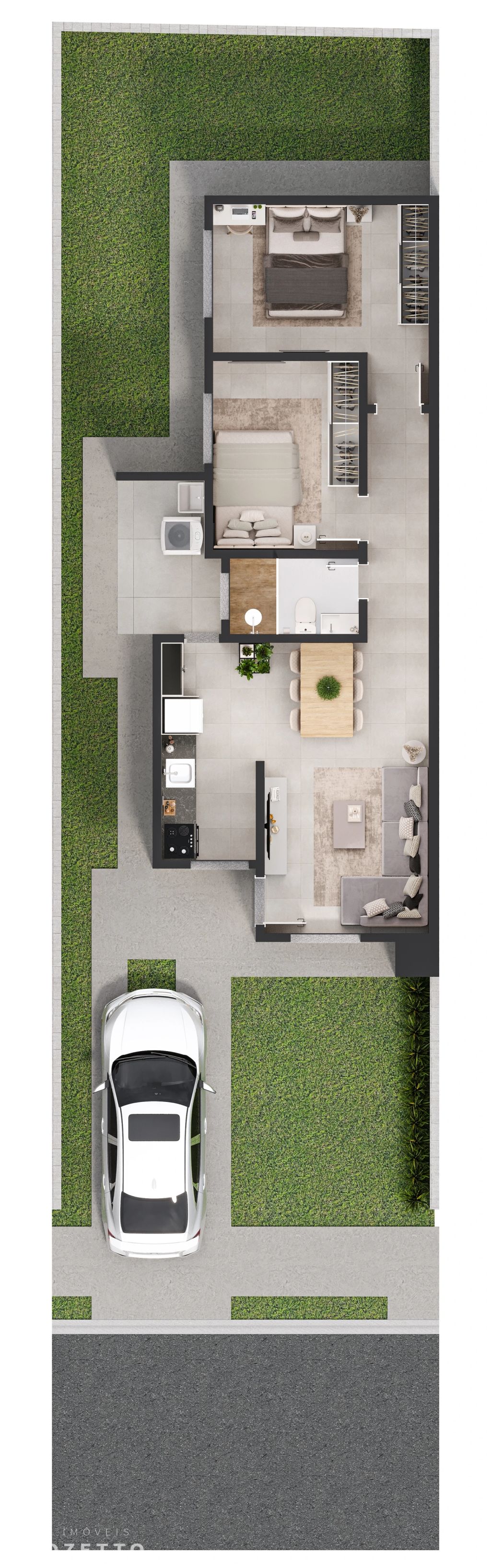 Casas com PASSAGEM LATERAL e em LAJE, área privativa de 55,84m², dispostas em 2 amplos dormitórios, sala e cozinha em conceito aberto, banheiro social, área de serviço, garagem, espaço de terreno nos fundos além da passagem lateral!