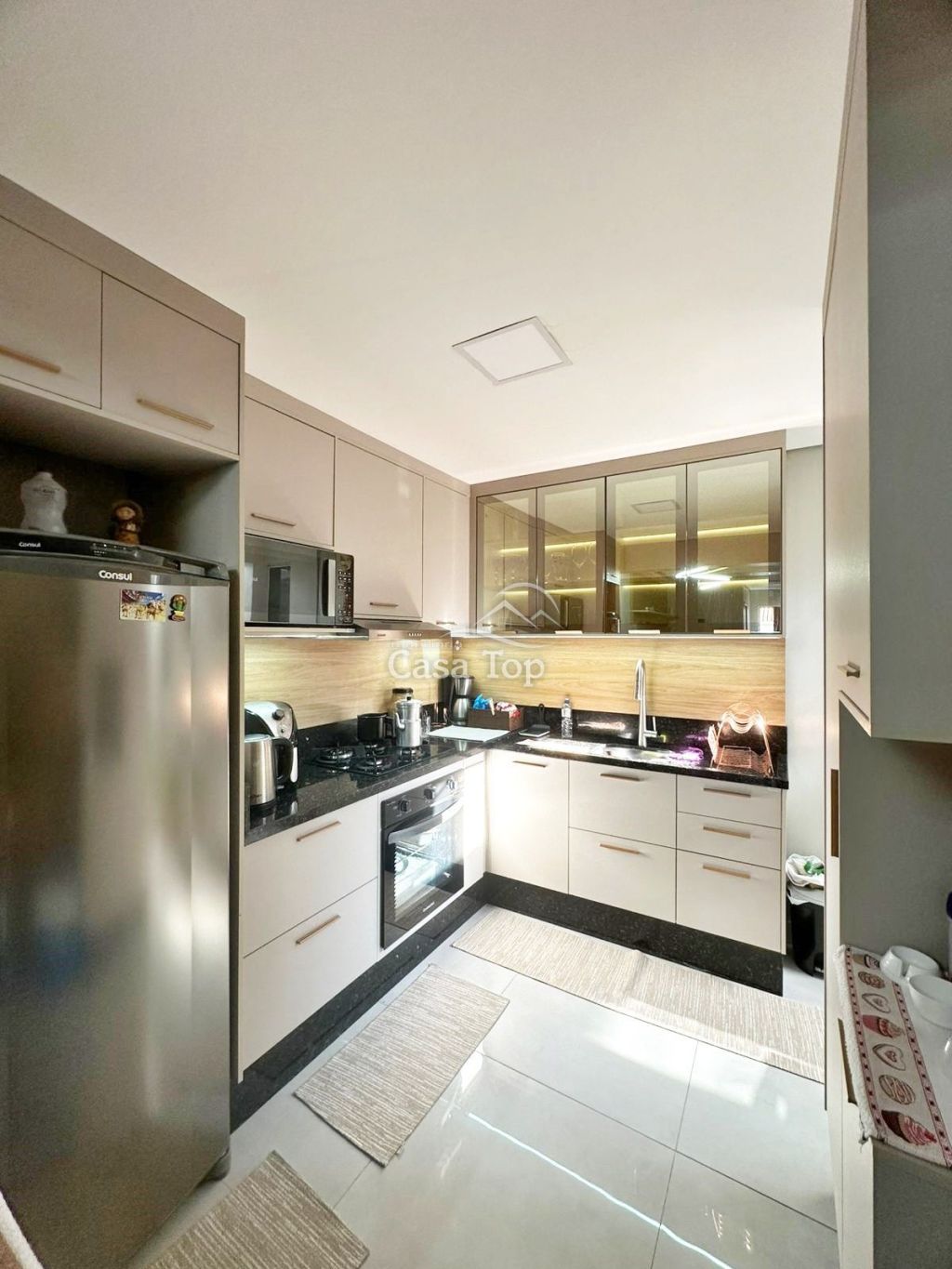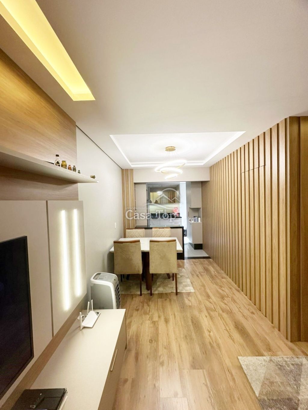 *Piso laminado de madeira e porcelanato na cozinha;