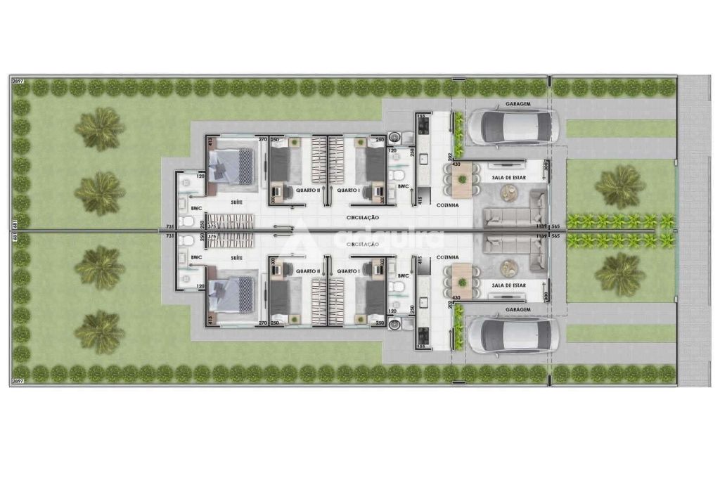 As residências possuem 70 m² de área construída, com projeto arquitetônico moderno e diferenciado, incluindo três quartos (sendo uma suíte) e pé-direito duplo, proporcionando amplitude e conforto.