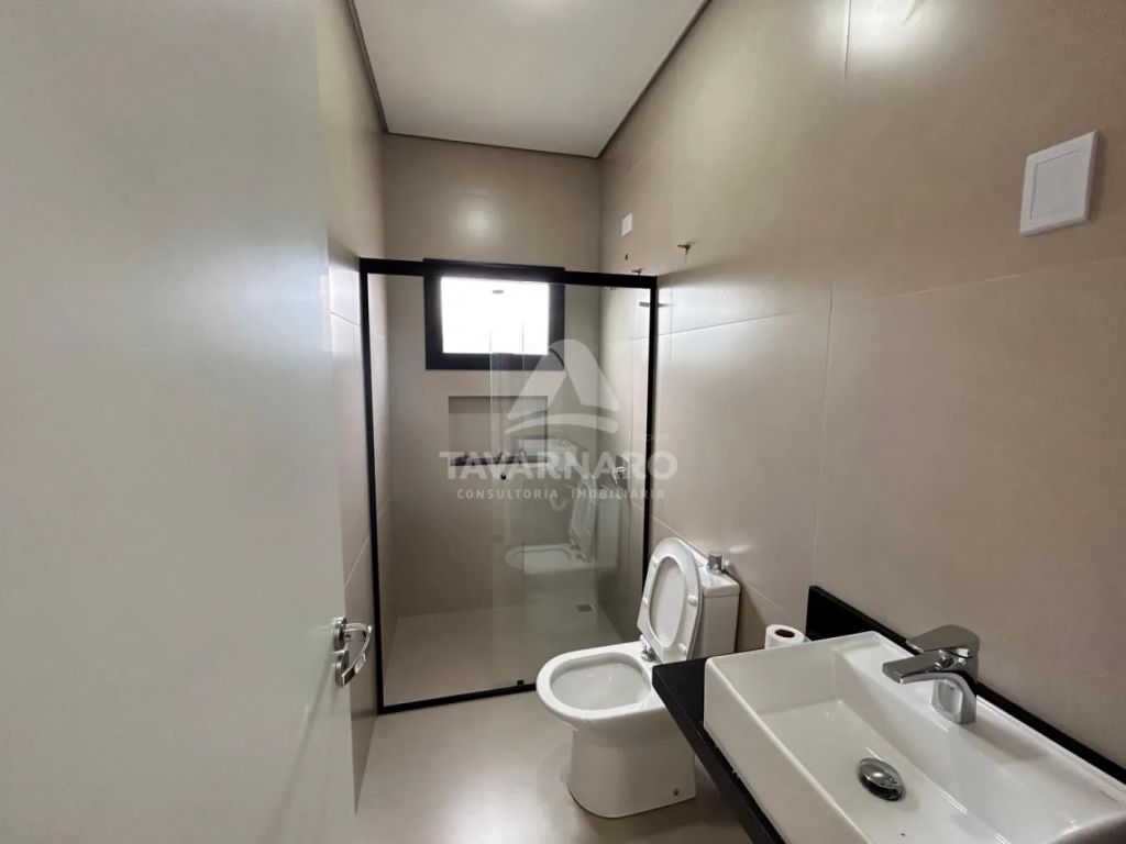 Os banheiros seguem um estilo moderno, com box em vidro, bancada preta e ventilação natural por janelas.