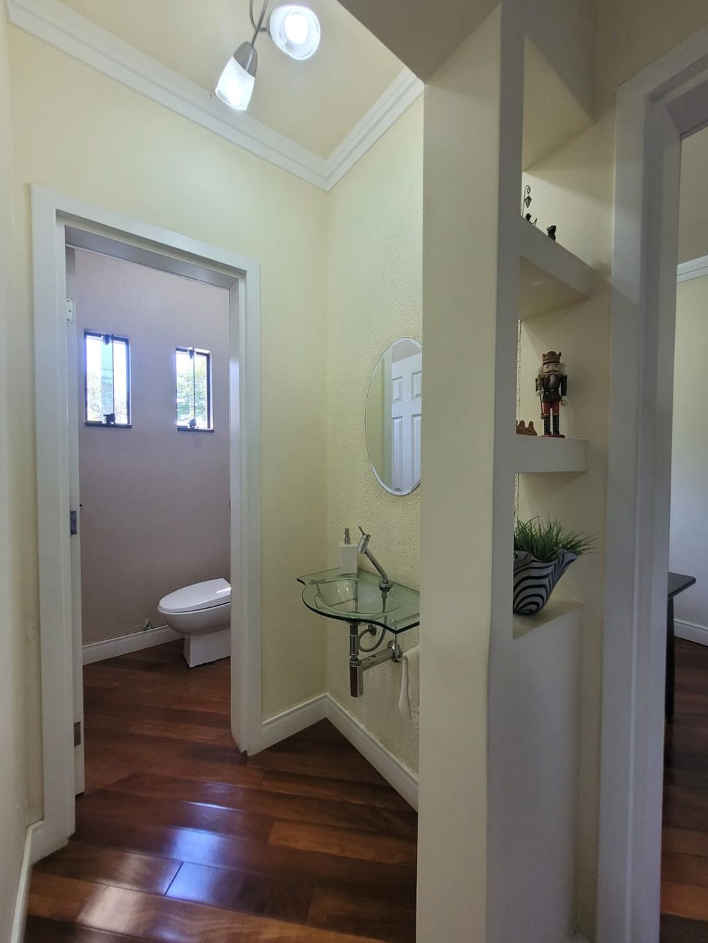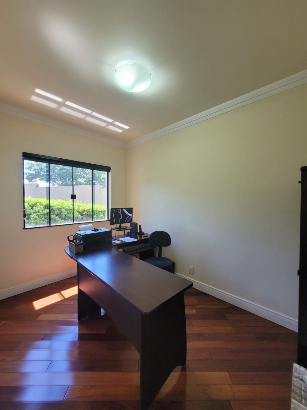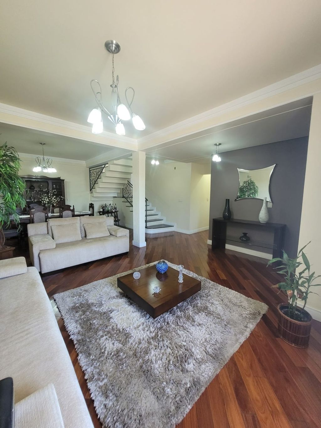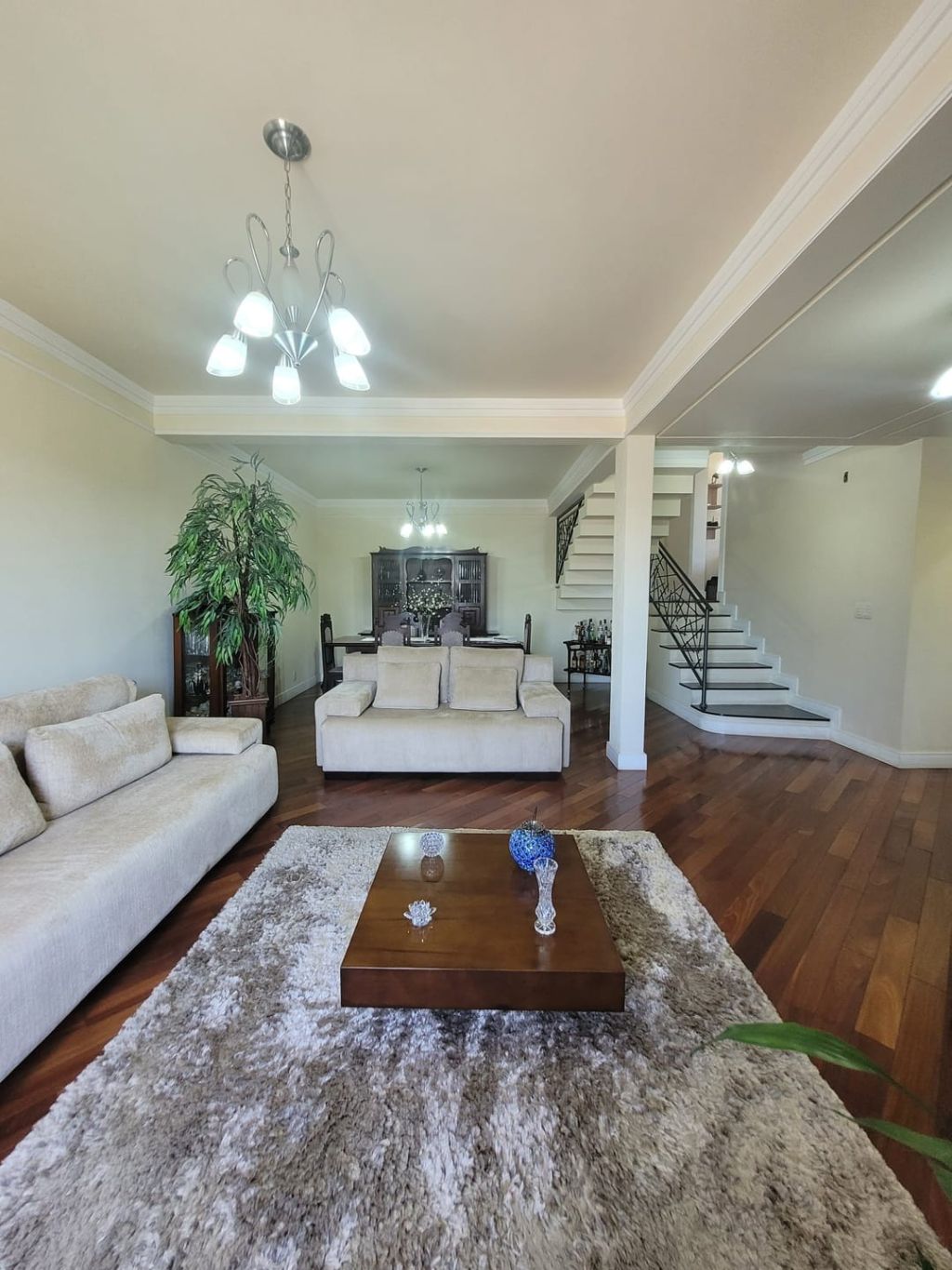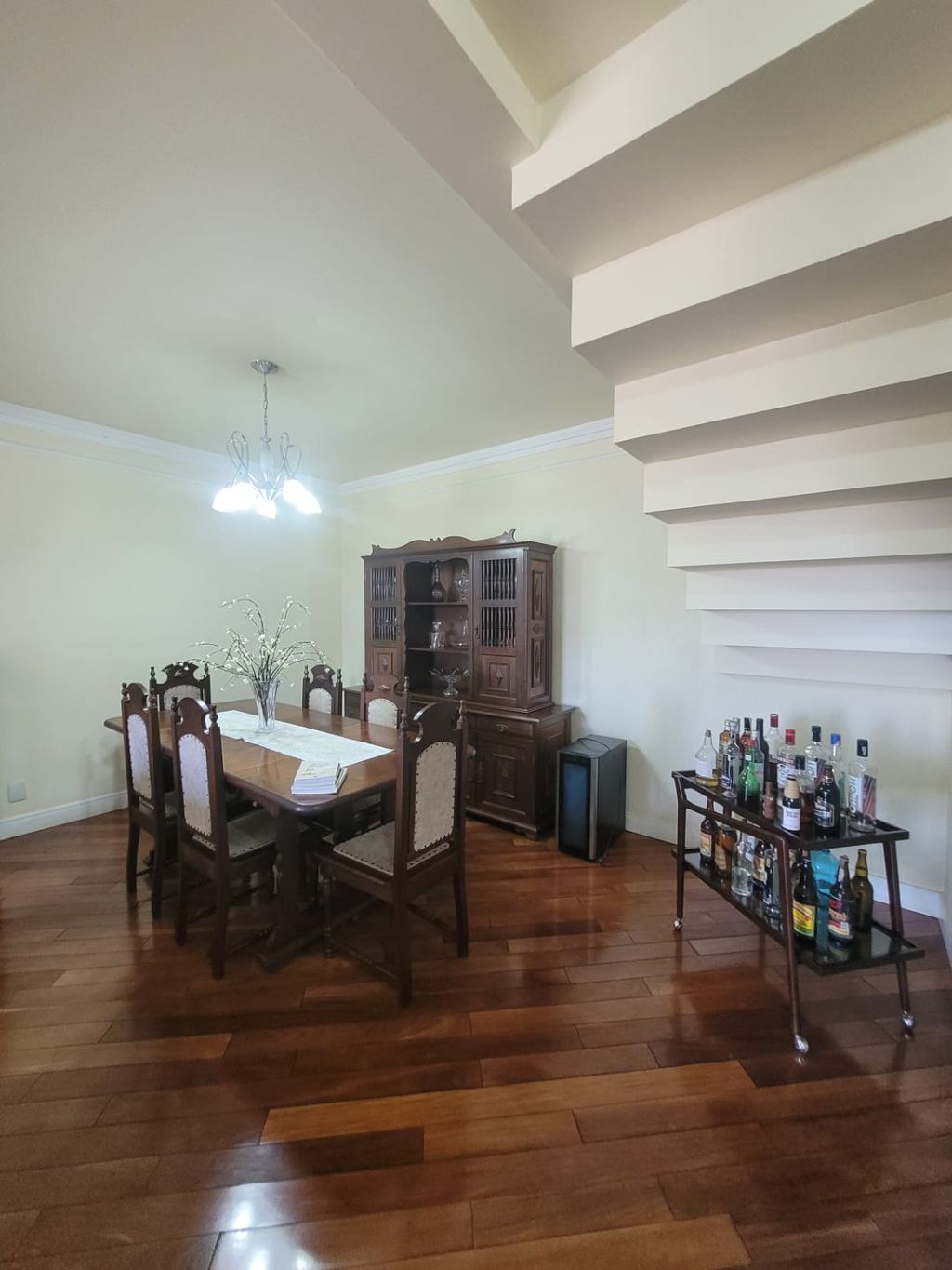 Piso inferior: Hall de entrada, sala ampla para dois ambientes, escritório, lavabo, sala intima de TV, cozinha com planejados, área gourmet com churrasqueira, banheiro social, lavanderia, despensa, duas vagas de garagem coberta e duas vagas descobertas e amplo quintal.
