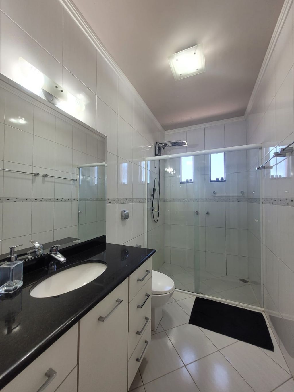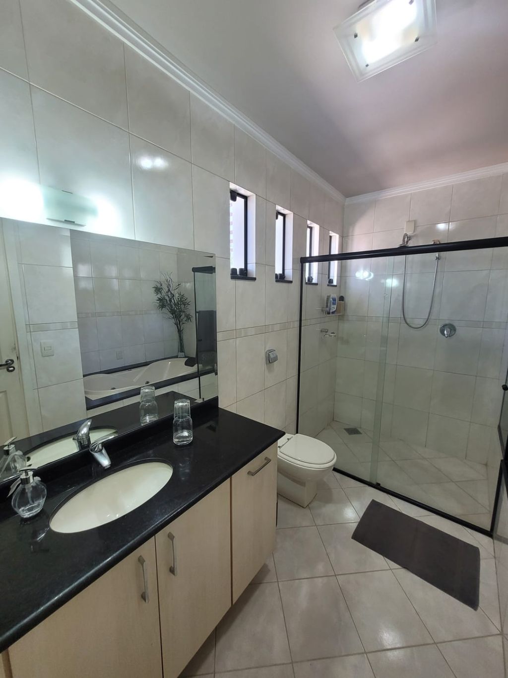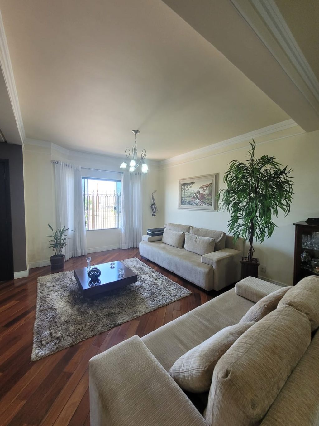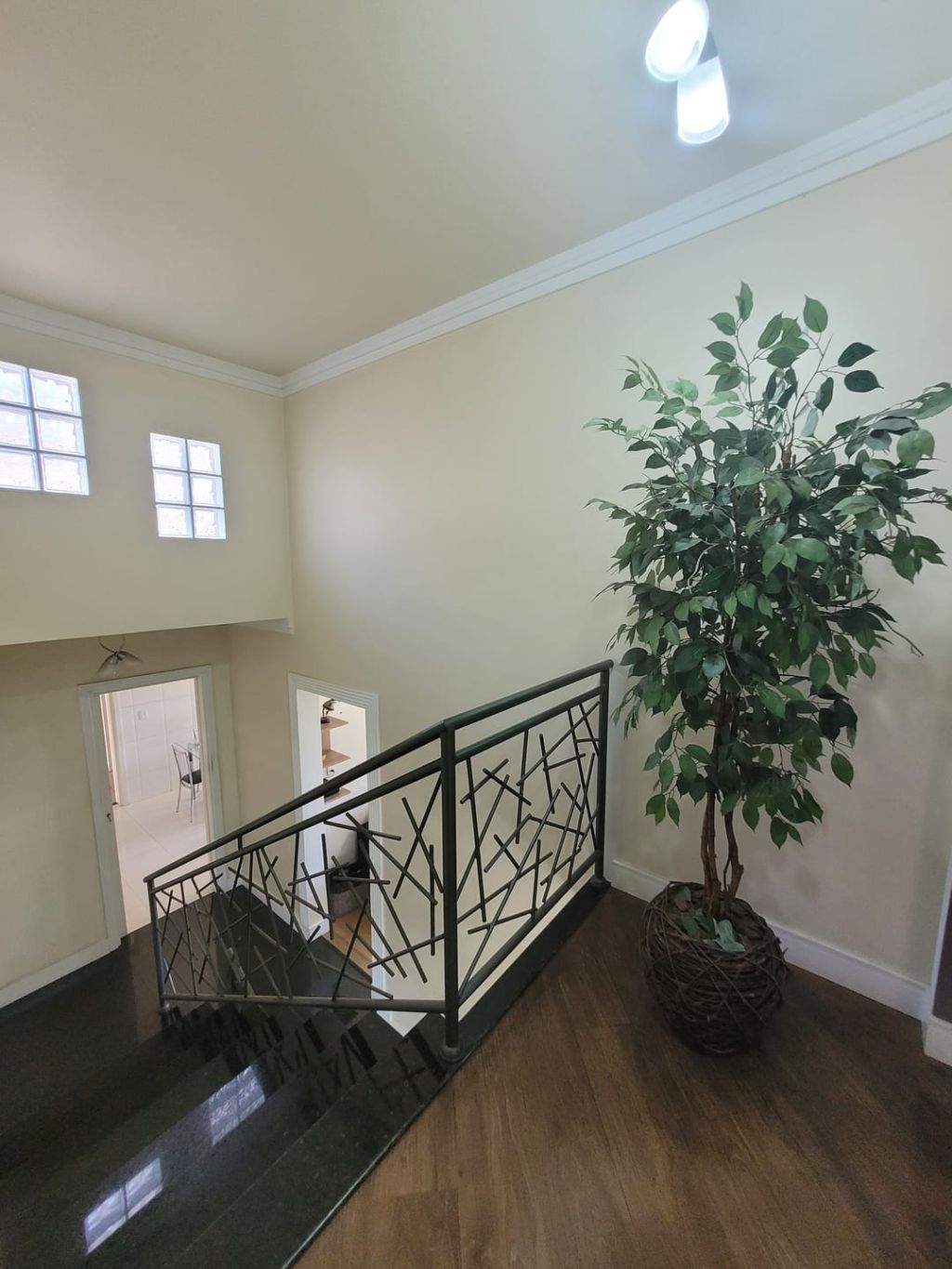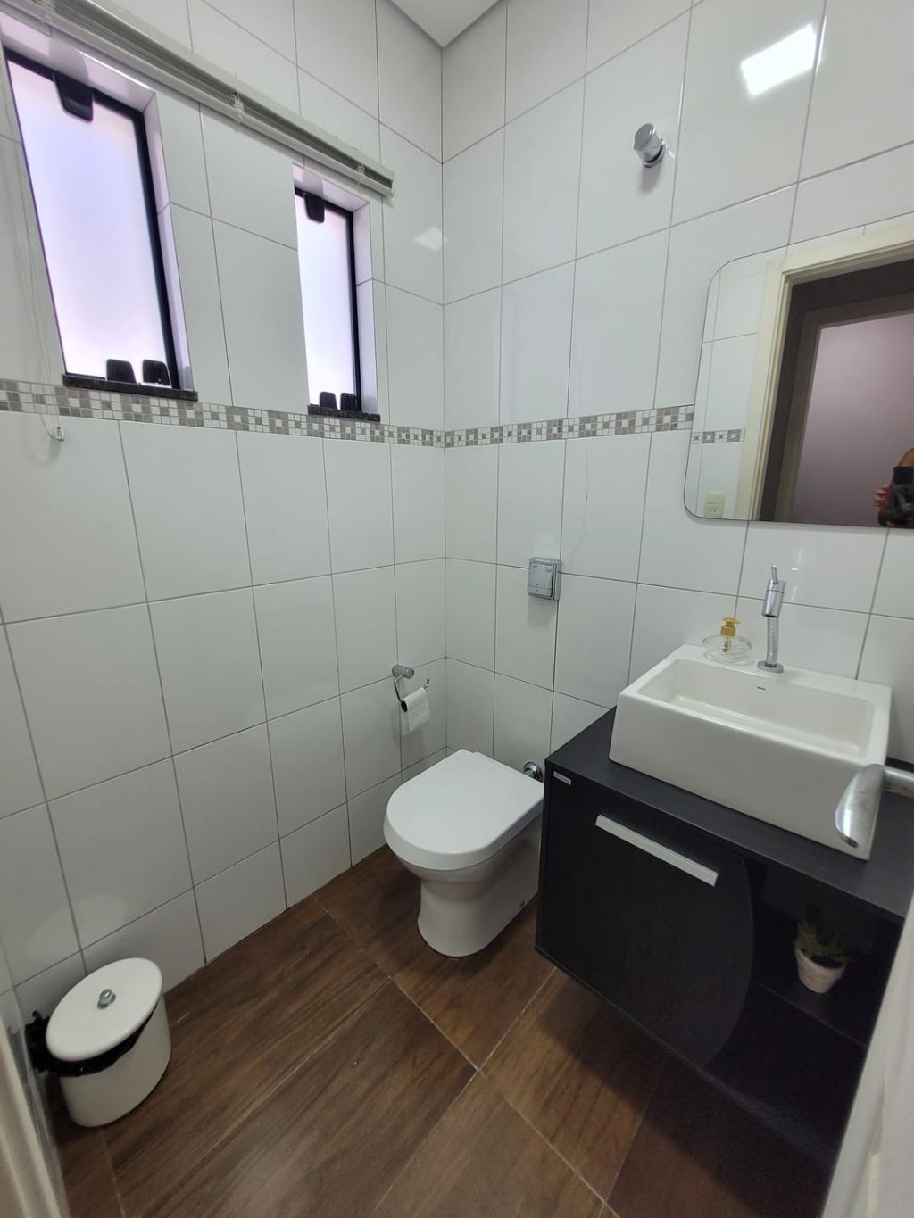 Piso inferior: Hall de entrada, sala ampla para dois ambientes, escritório, lavabo, sala intima de TV, cozinha com planejados, área gourmet com churrasqueira, banheiro social, lavanderia, despensa, duas vagas de garagem coberta e duas vagas descobertas e amplo quintal.