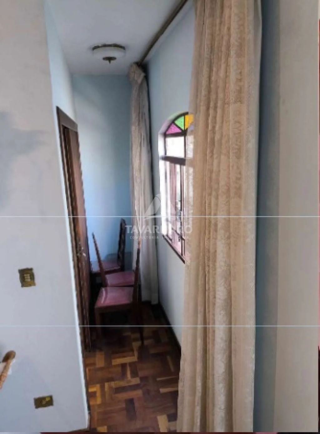 *Esquadrias em madeira 2 folhas de abrir, bandeira e vergas em arco pleno, porta principal com marquise em ferro e vidros coloridos.