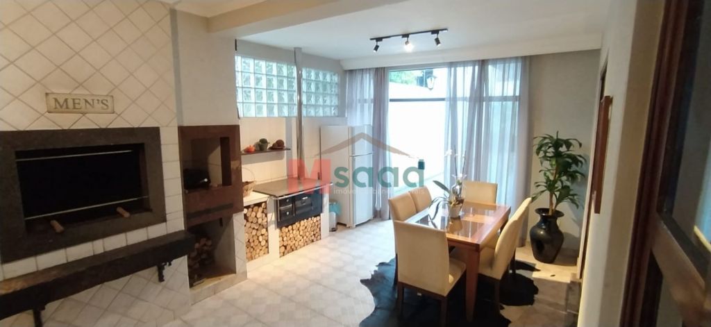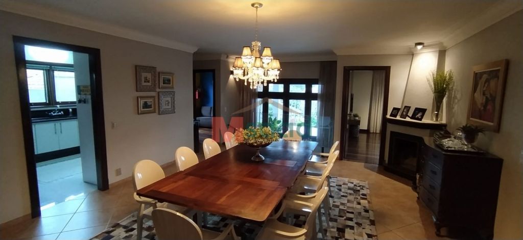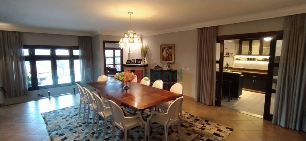 Sala de jantar ampla com lareira para mesa de até 12 lugares e ainda sobra espaço