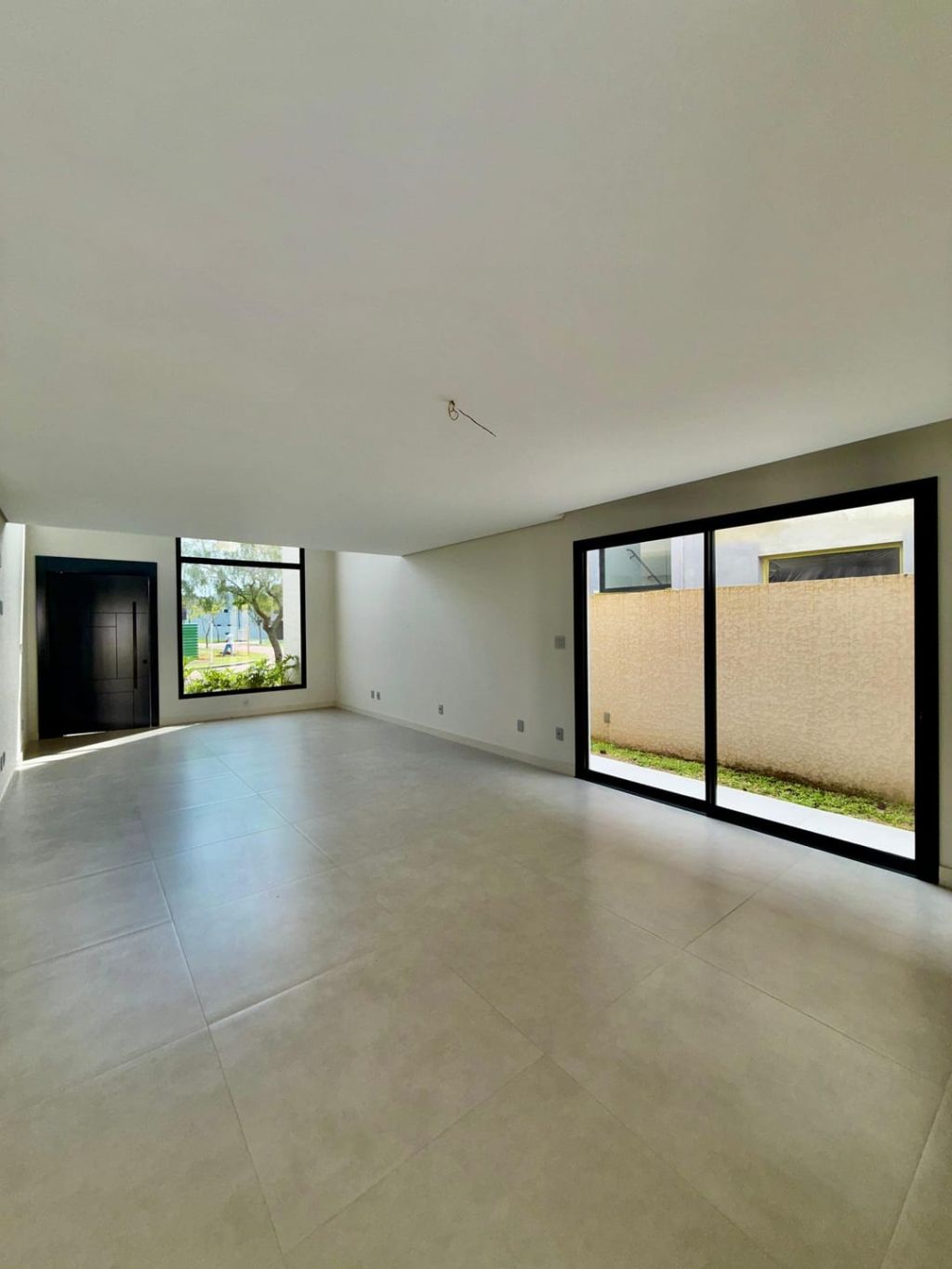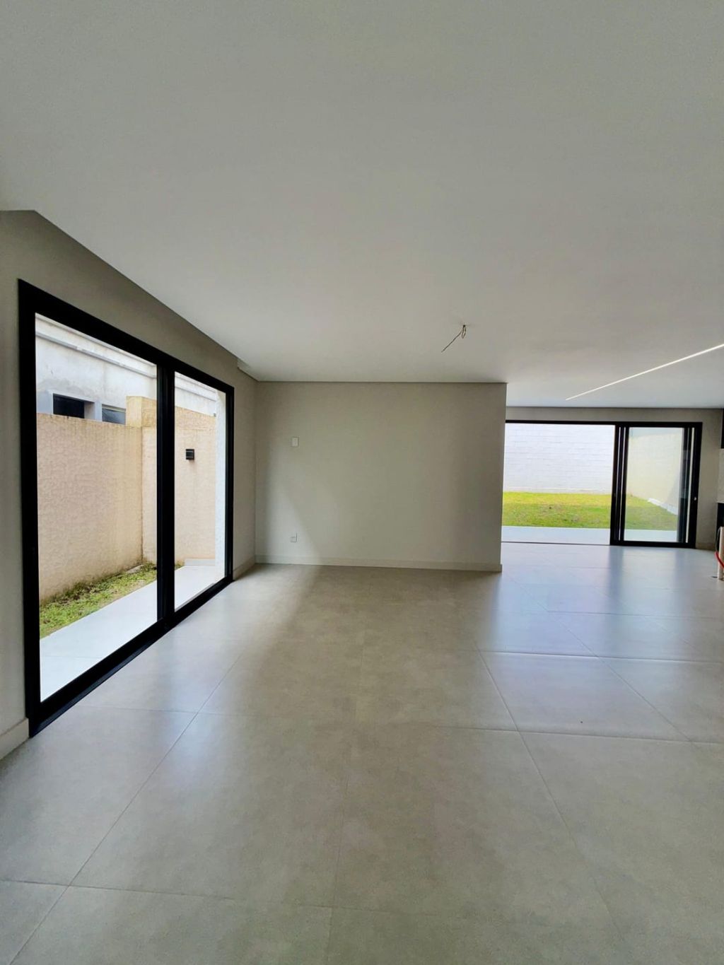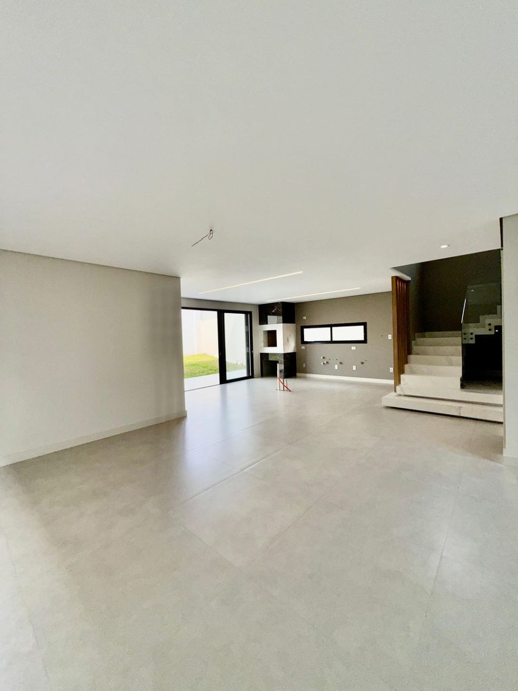 Piso inferior: Sala ampla com pé direito duplo integrada a sala de jantar, cozinha e área gourmet e lavabo. Na área externa fica a área de serviço, banheiro social e uma despensa e garagem para dois carros cobertos e descoberta para mais dois.