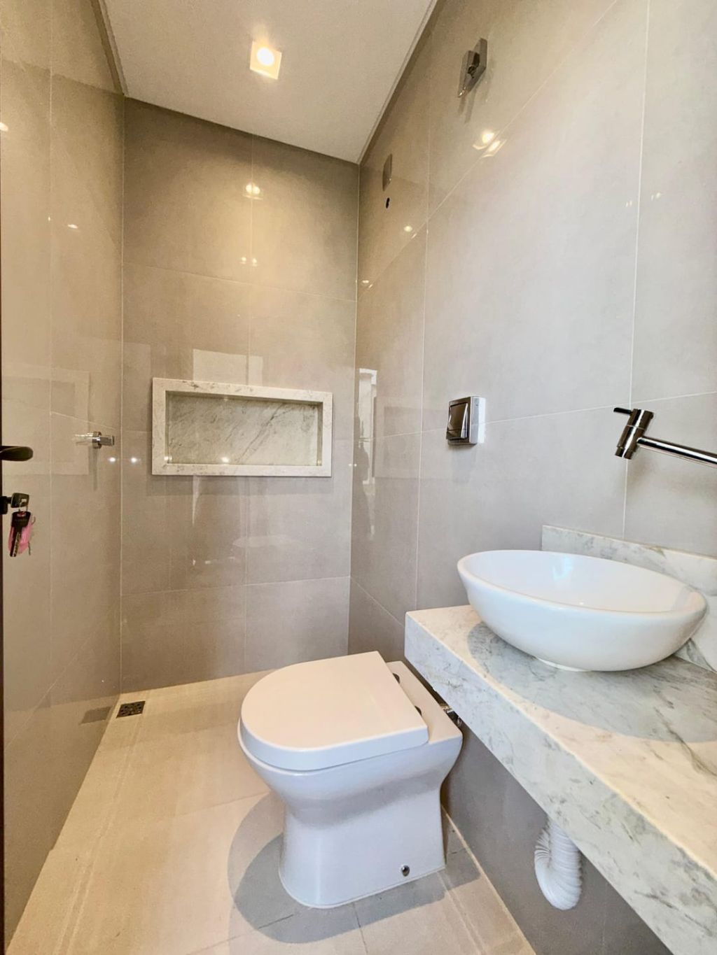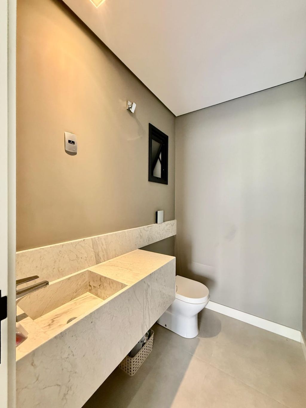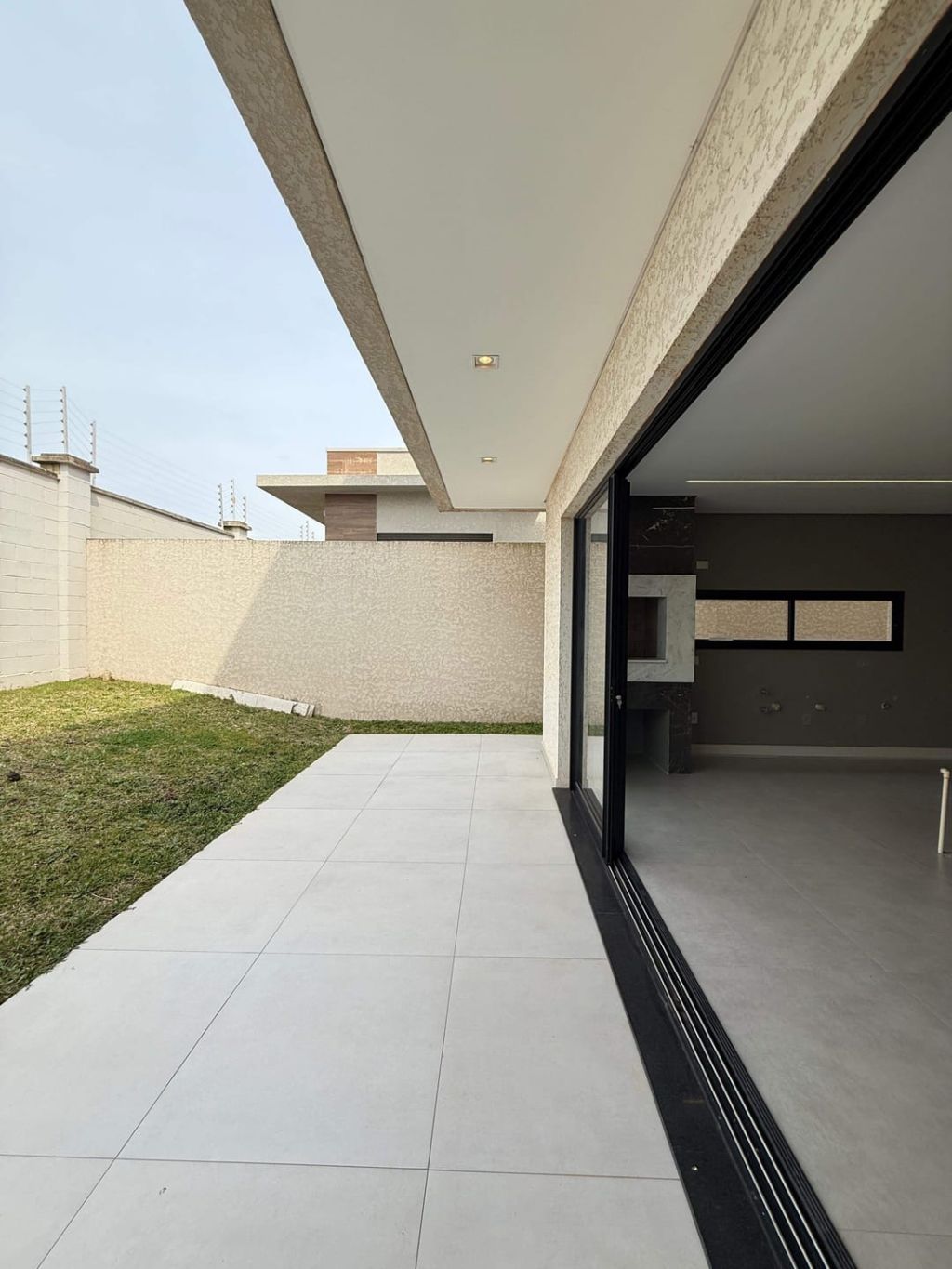 Piso inferior: Sala ampla com pé direito duplo integrada a sala de jantar, cozinha e área gourmet e lavabo. Na área externa fica a área de serviço, banheiro social e uma despensa e garagem para dois carros cobertos e descoberta para mais dois.