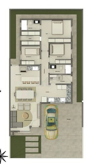 Residência medindo aprox. 126m², contendo 3 quartos (sendo 1 suíte com closet), sala de estar, sala de jantar integrada com a área gourmet, cozinha, área de serviço e 2 vagas de garagem.