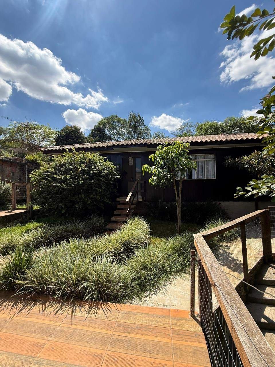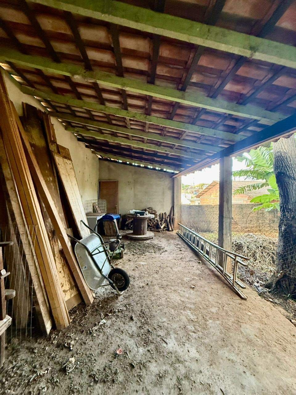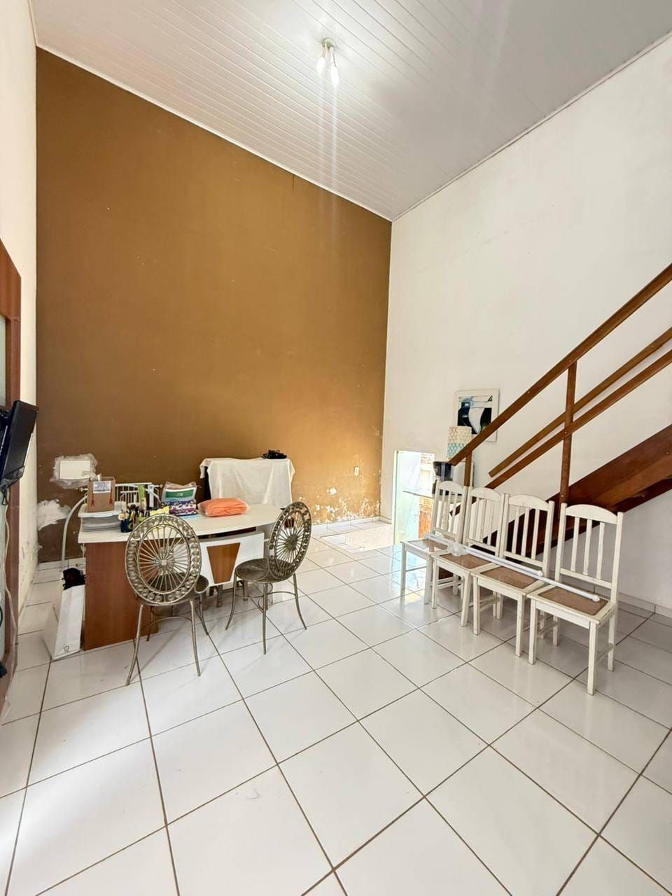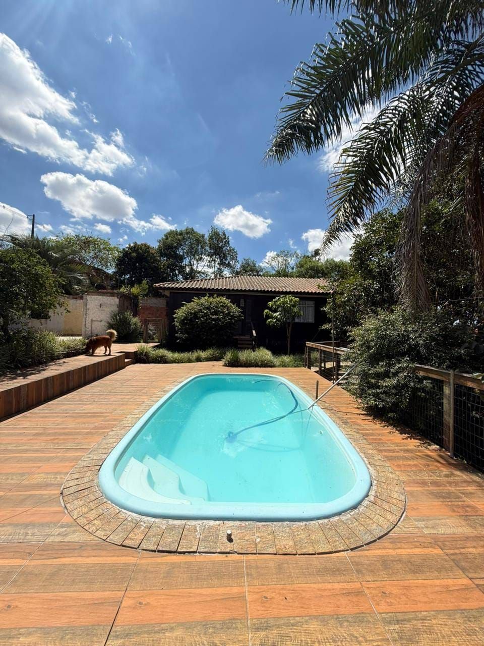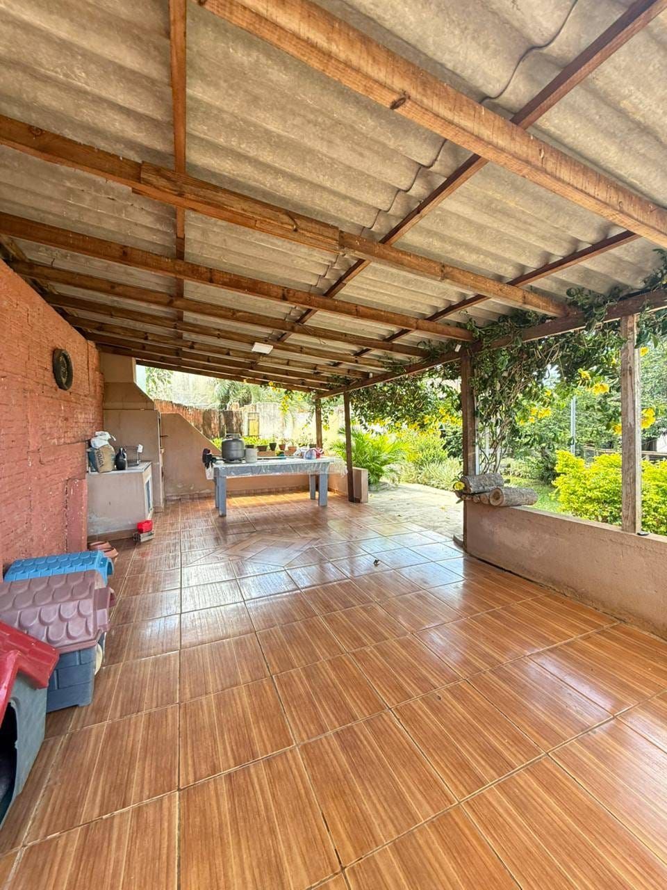 Casa mista com aproximadamente 52 metros quadrados, contendo: 01 quarto, sala de estar integrada a sala de jantar e a cozinha com planejados, banheiro social, área de serviço, garagem coberta para dois carros, churrasqueira, piscina, lago de peixes, banheiro social, um quarto que serve como depósito inacabado, salão aberto e amplo espaço de quintal.
