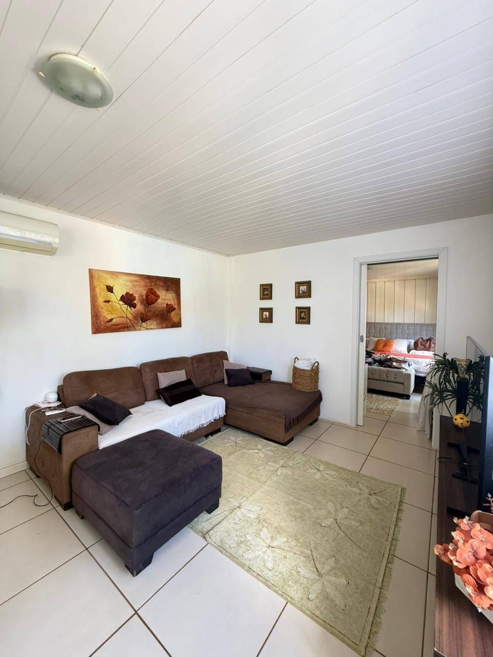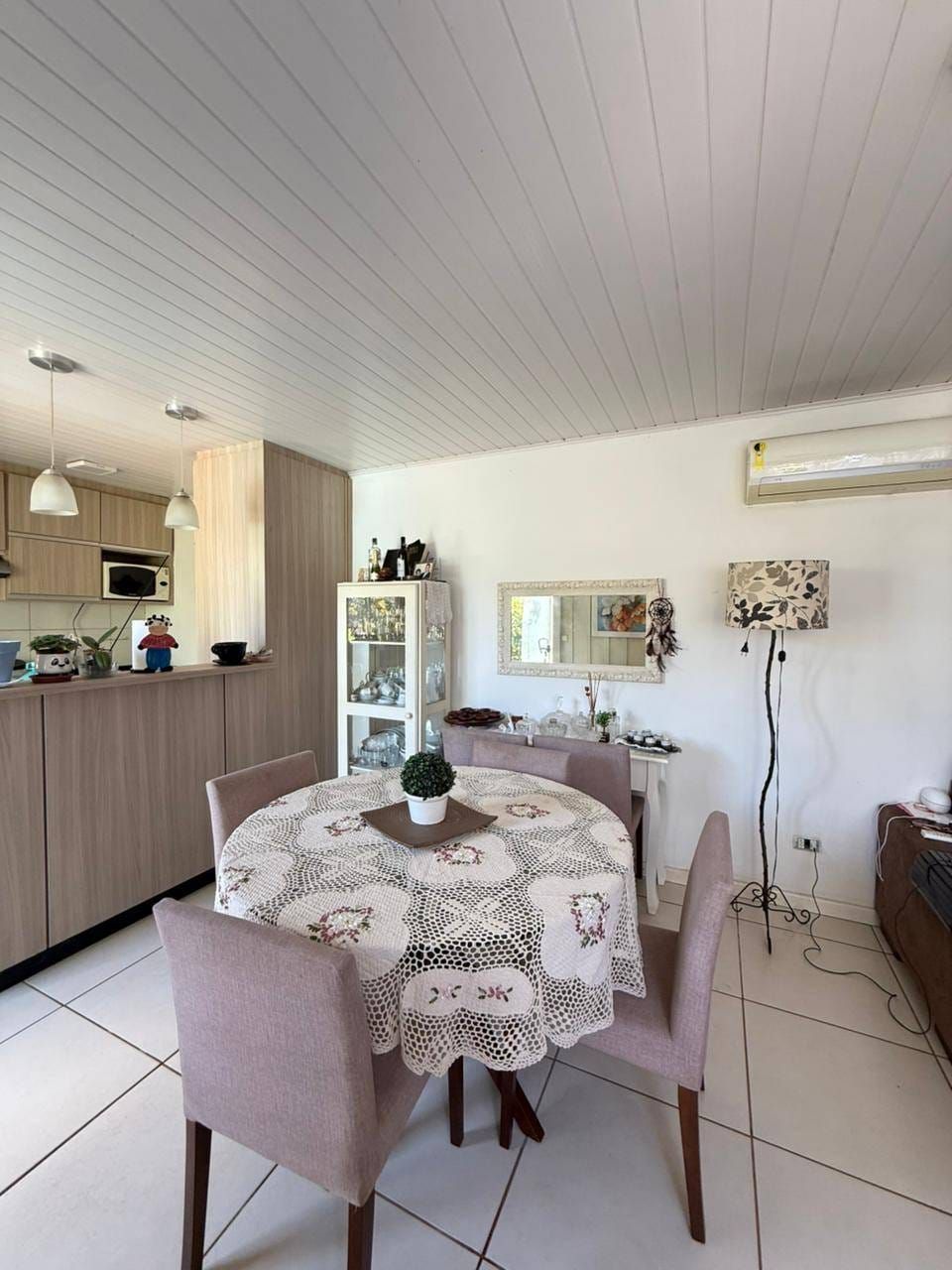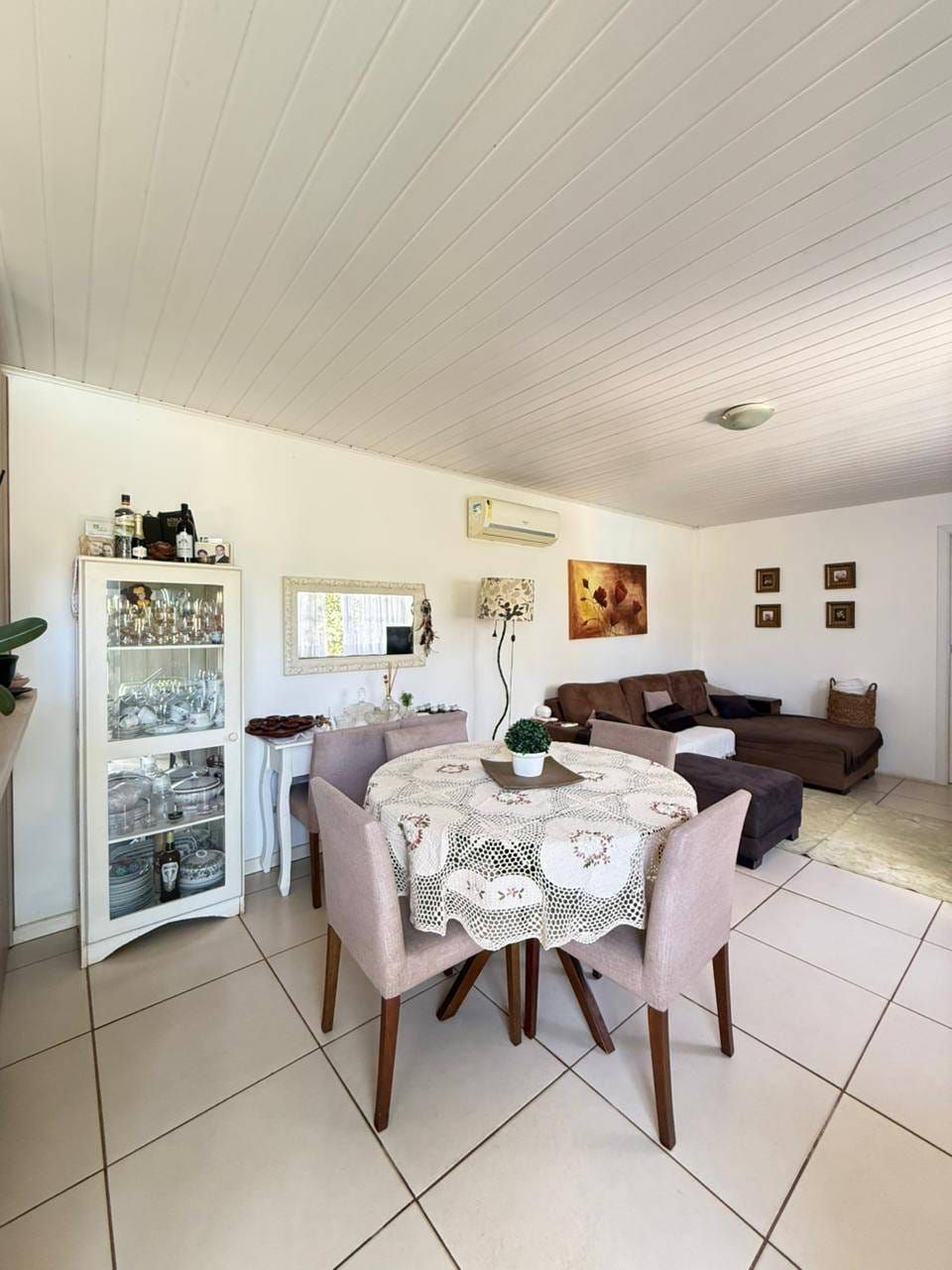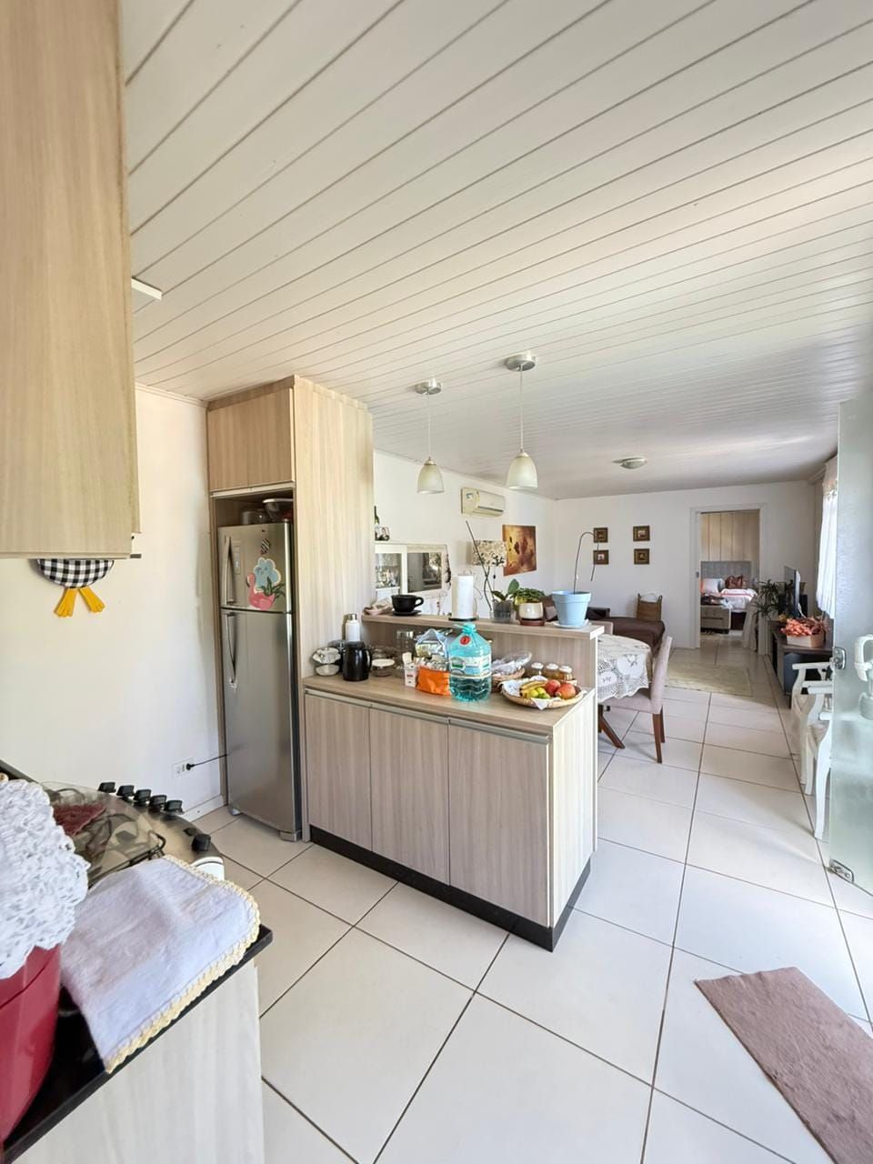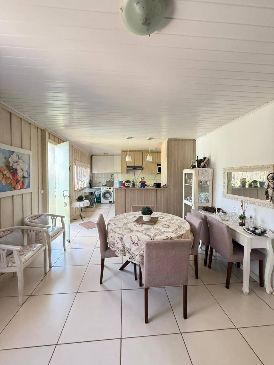 Casa mista com aproximadamente 52 metros quadrados, contendo: 01 quarto, sala de estar integrada a sala de jantar e a cozinha com planejados, banheiro social, área de serviço, garagem coberta para dois carros, churrasqueira, piscina, lago de peixes, banheiro social, um quarto que serve como depósito inacabado, salão aberto e amplo espaço de quintal.