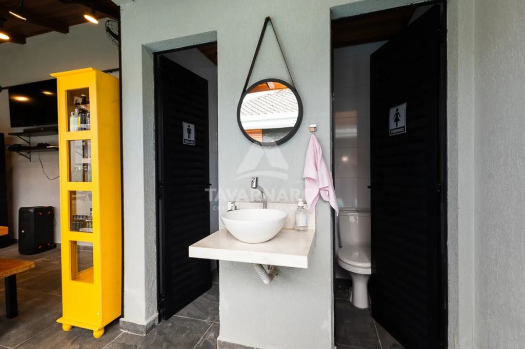 Edícula com banheiro masculino e feminino, lavanderia e churrasqueira.