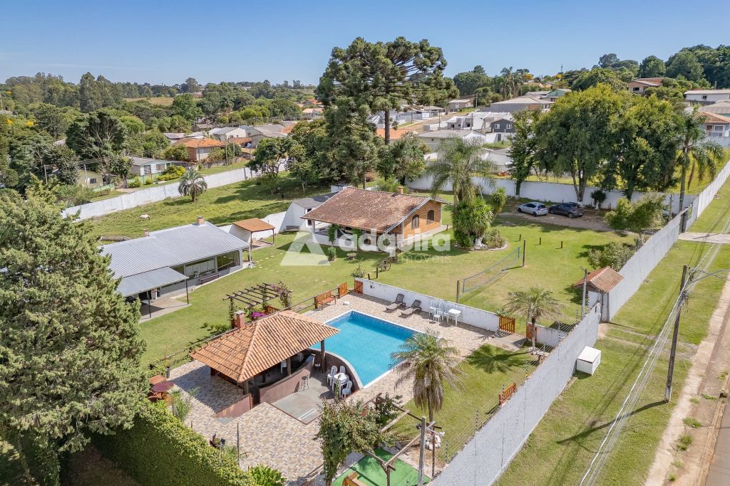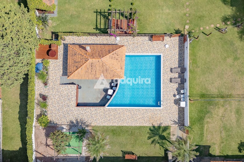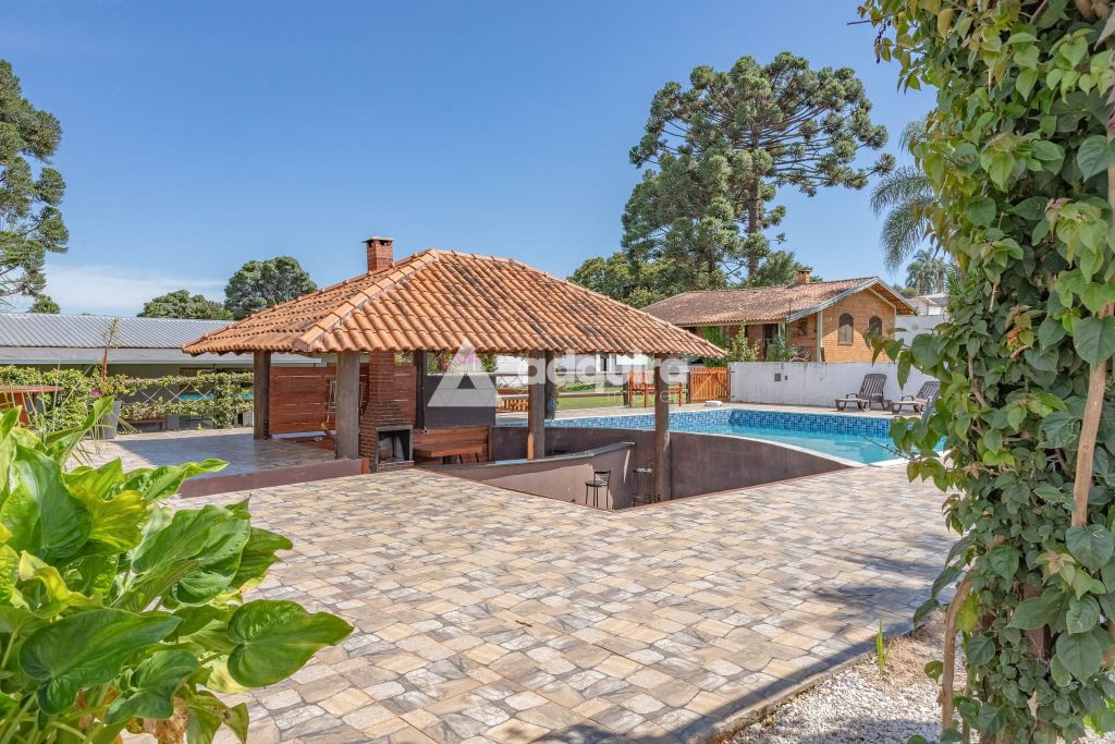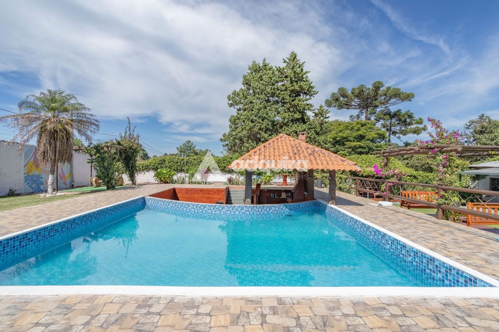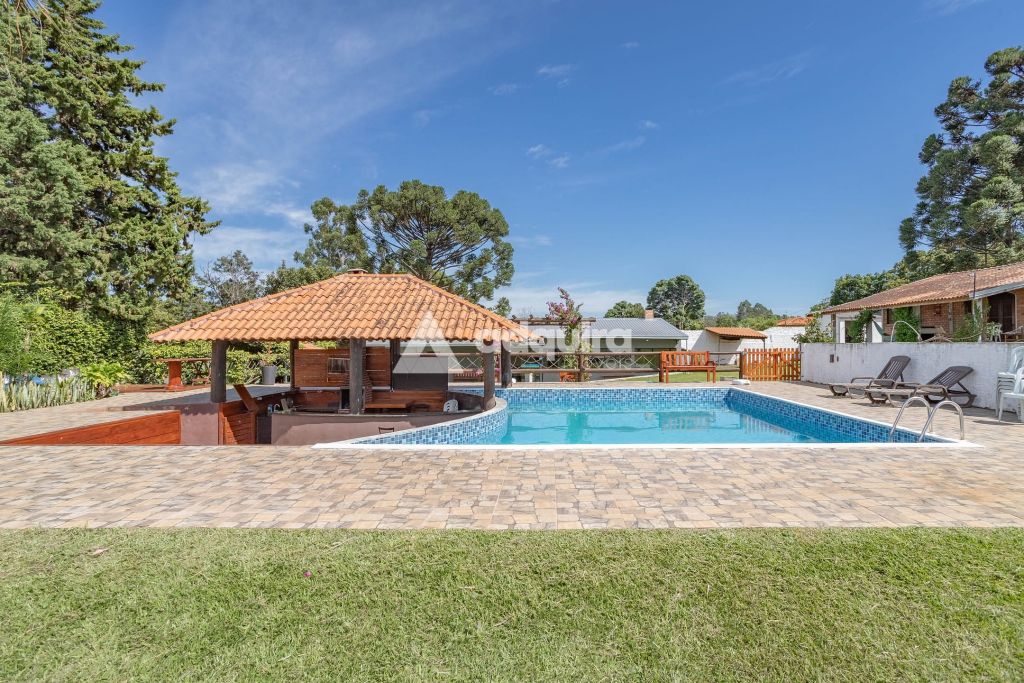 Na área externa, a estrutura se destaca pelas múltiplas opções de convivência. O projeto contempla uma piscina de 50m² com acesso direto a um quiosque prático com churrasqueira. Além disso, a chácara oferece um segundo espaço gourmet independente e bastante amplo de 100m², quadra de vôlei, pergolados, diversas áreas de descanso, depósito e um pátio generoso para estacionamento.