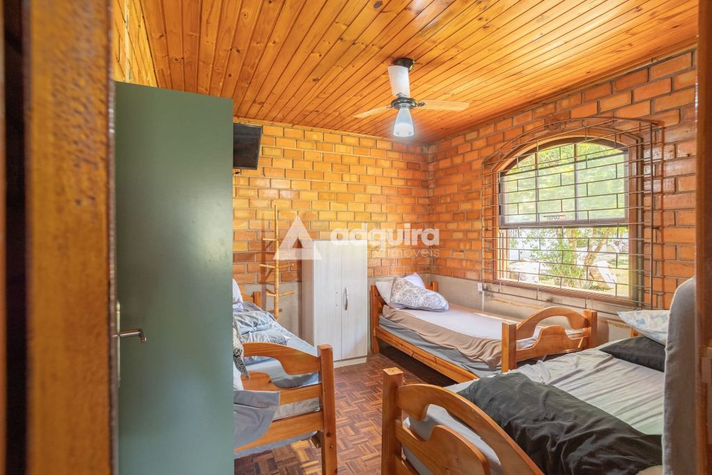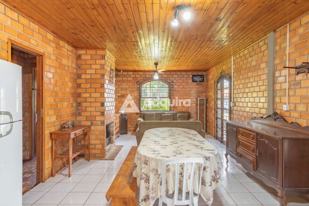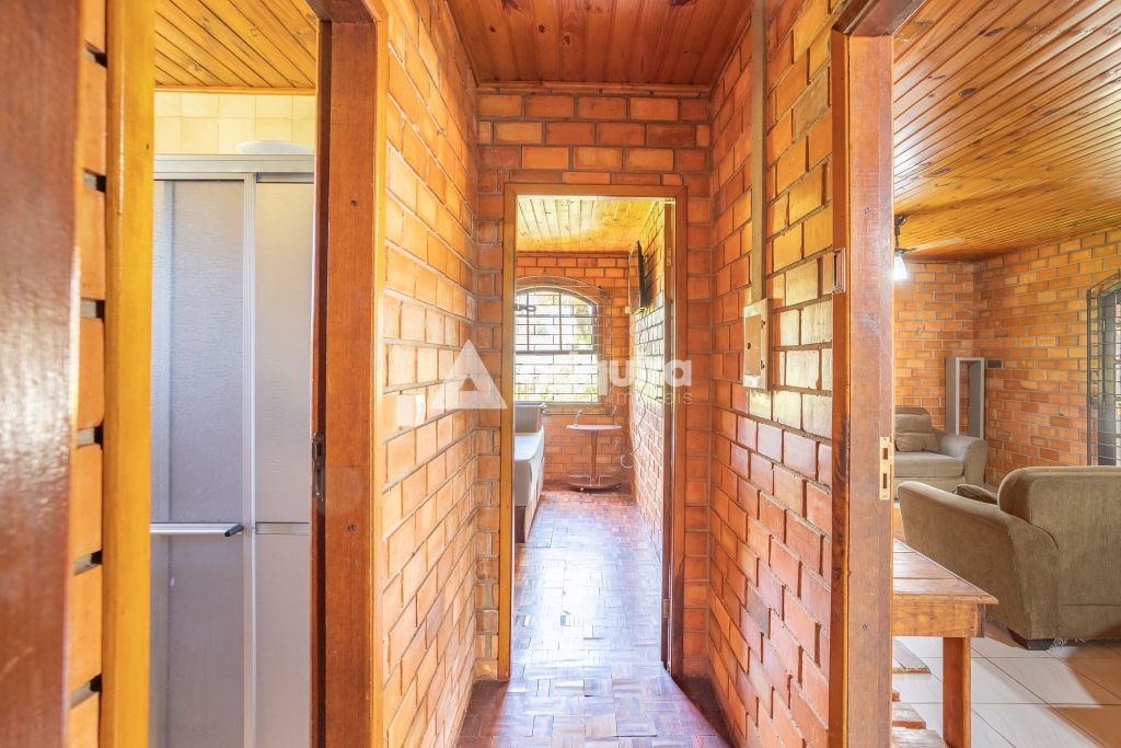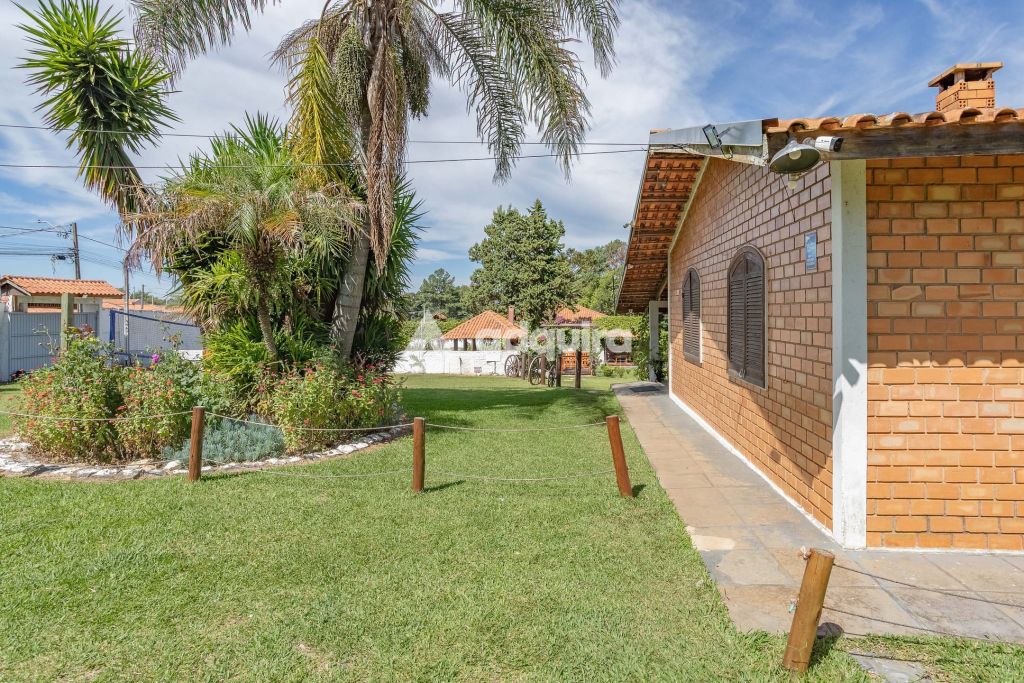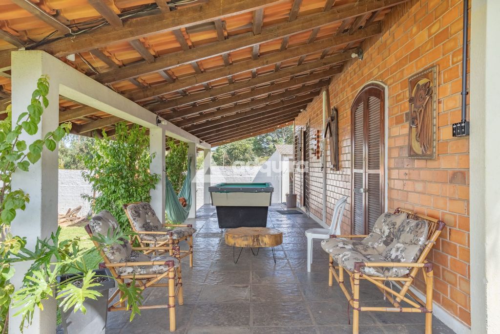 A casa principal, com 12o m² de área construída possui uma arquitetura charmosa em tijolinhos aparentes, contornada por uma varanda espaçosa que já abriga uma mesa de sinuca. O interior foi projetado para ser funcional e aconchegante, apresentando uma sala de estar com lareira integrada de forma natural à sala de jantar e à cozinha. A área íntima dispõe de um banheiro amplo e dois quartos, sendo um de casal e outro configurado com beliches.