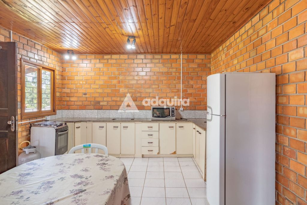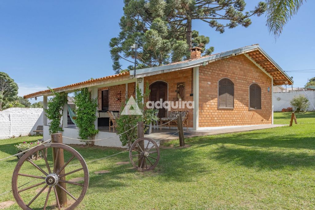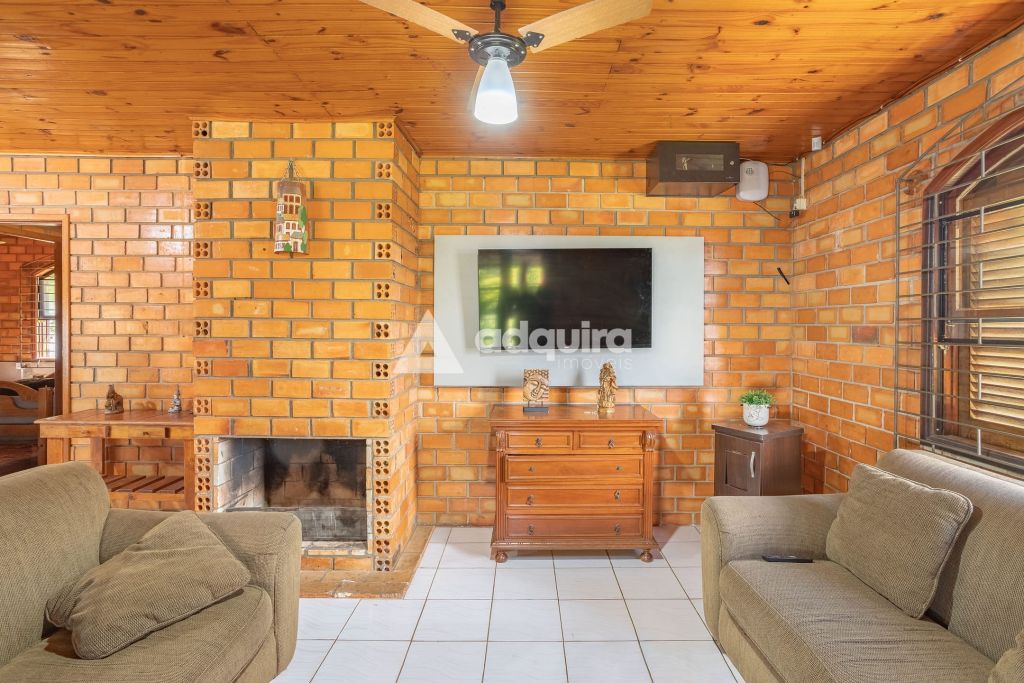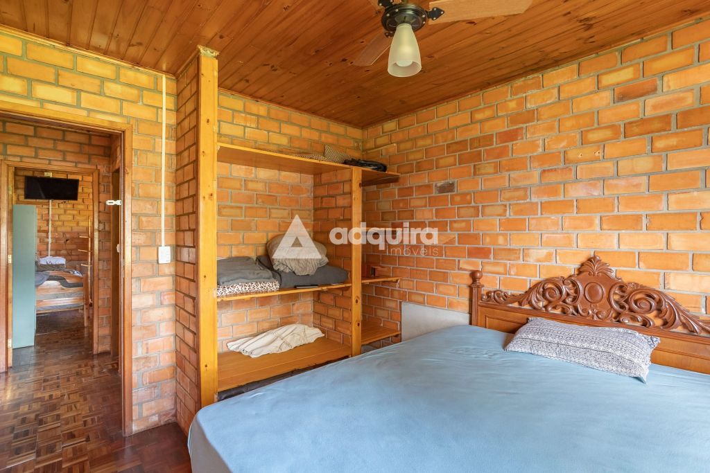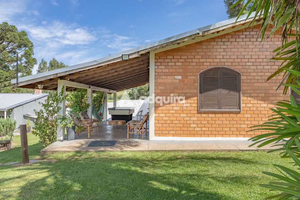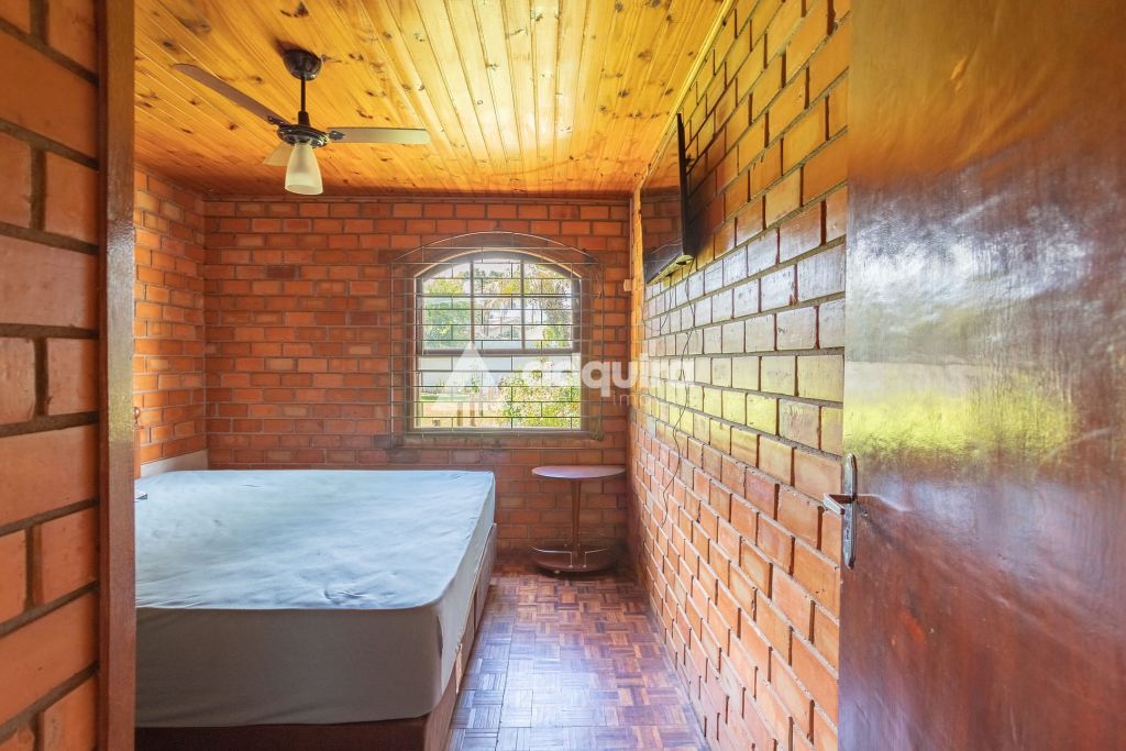 A casa principal, com 12o m² de área construída possui uma arquitetura charmosa em tijolinhos aparentes, contornada por uma varanda espaçosa que já abriga uma mesa de sinuca. O interior foi projetado para ser funcional e aconchegante, apresentando uma sala de estar com lareira integrada de forma natural à sala de jantar e à cozinha. A área íntima dispõe de um banheiro amplo e dois quartos, sendo um de casal e outro configurado com beliches.