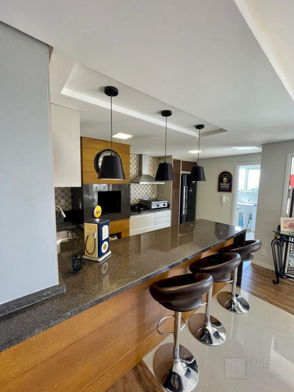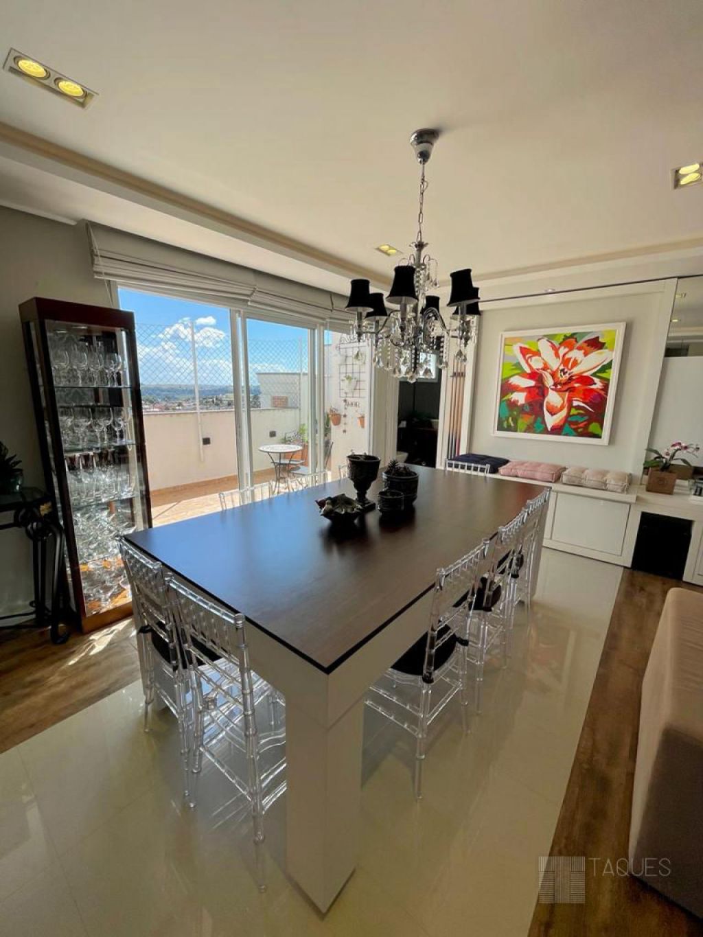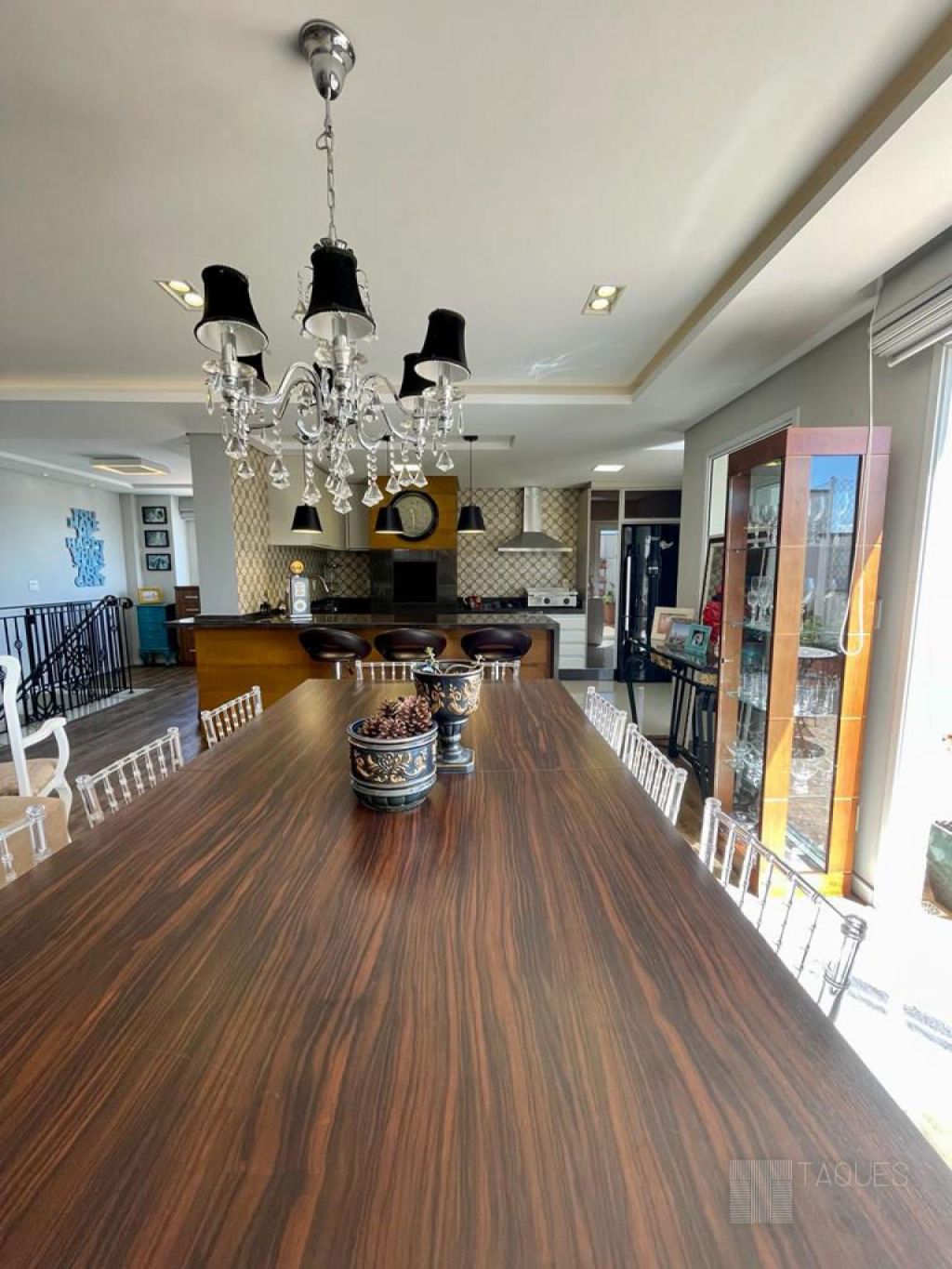 Já no piso superior temos espaço gourmet com churrasqueira, escritório, lavanderia, sala de estar e jantar, lavabo e um belíssimo terraço.