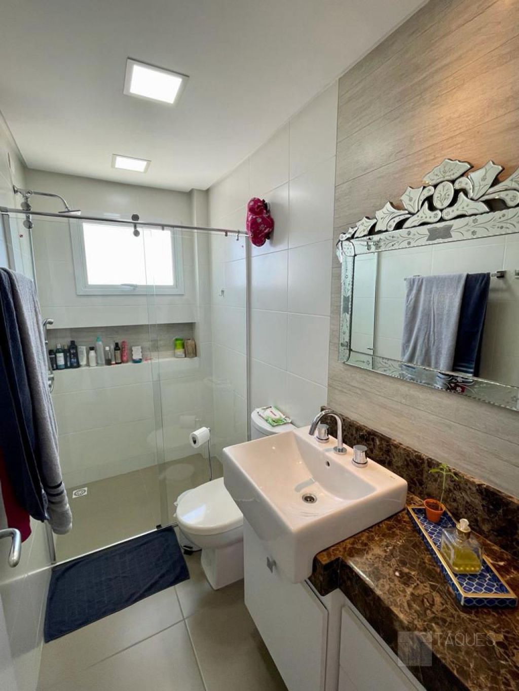 A cobertura é constituída, em seu piso inferior por 3 quartos sendo 1 suíte com closet, banheiro social, sala de tv e cozinha.