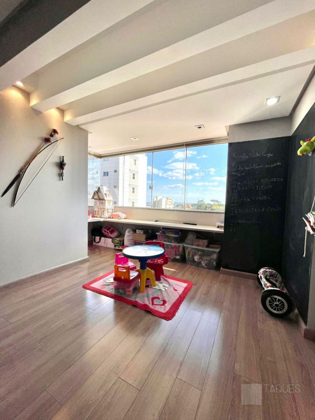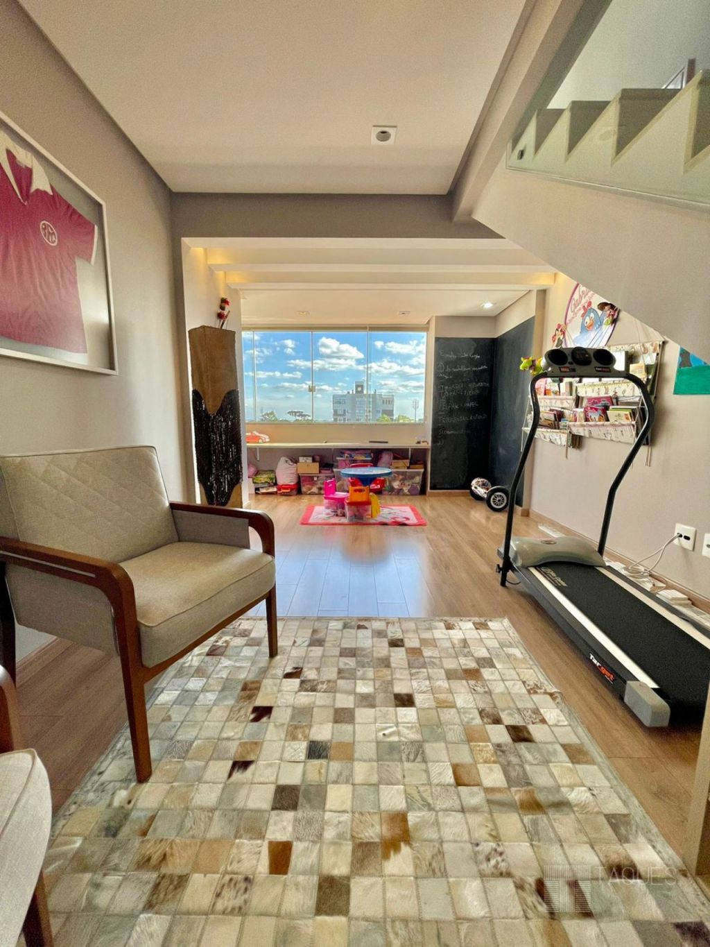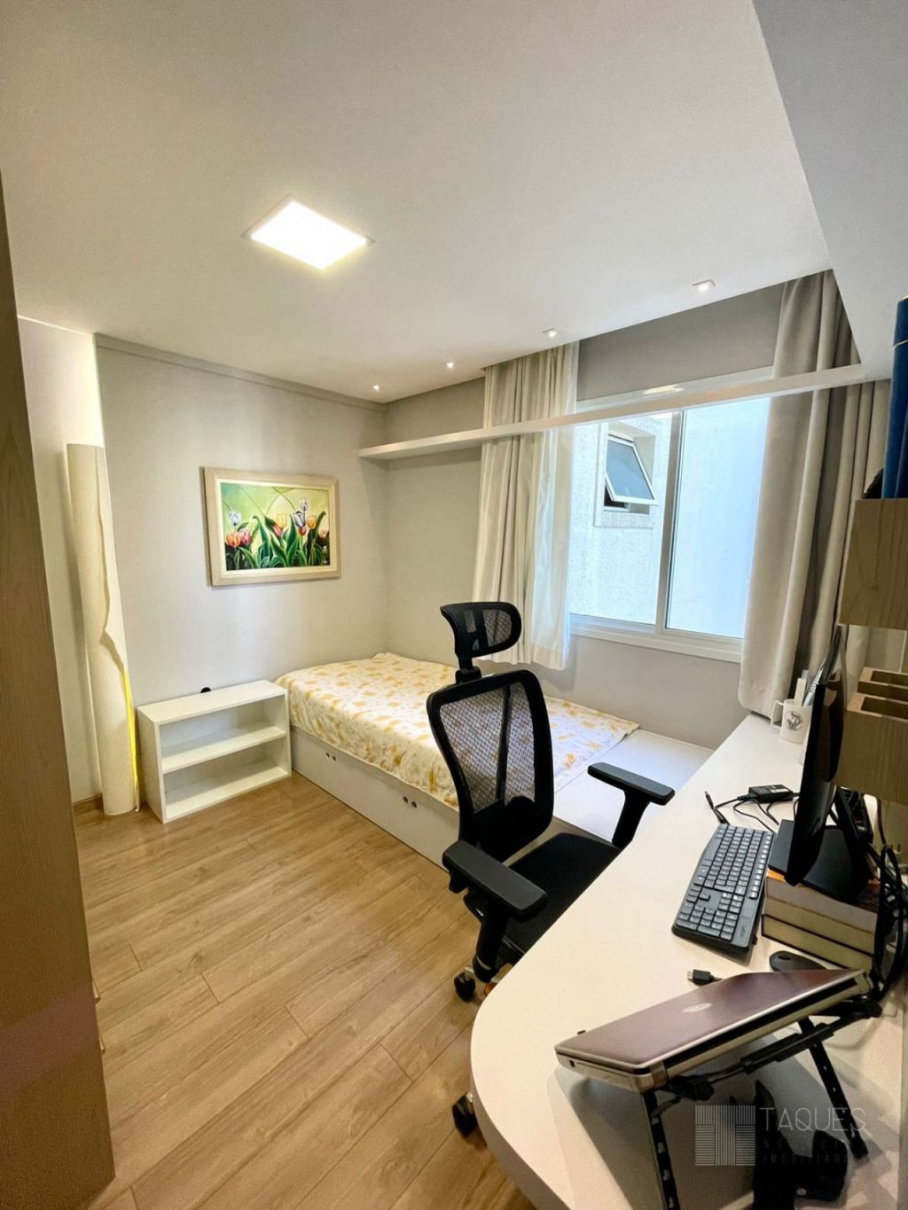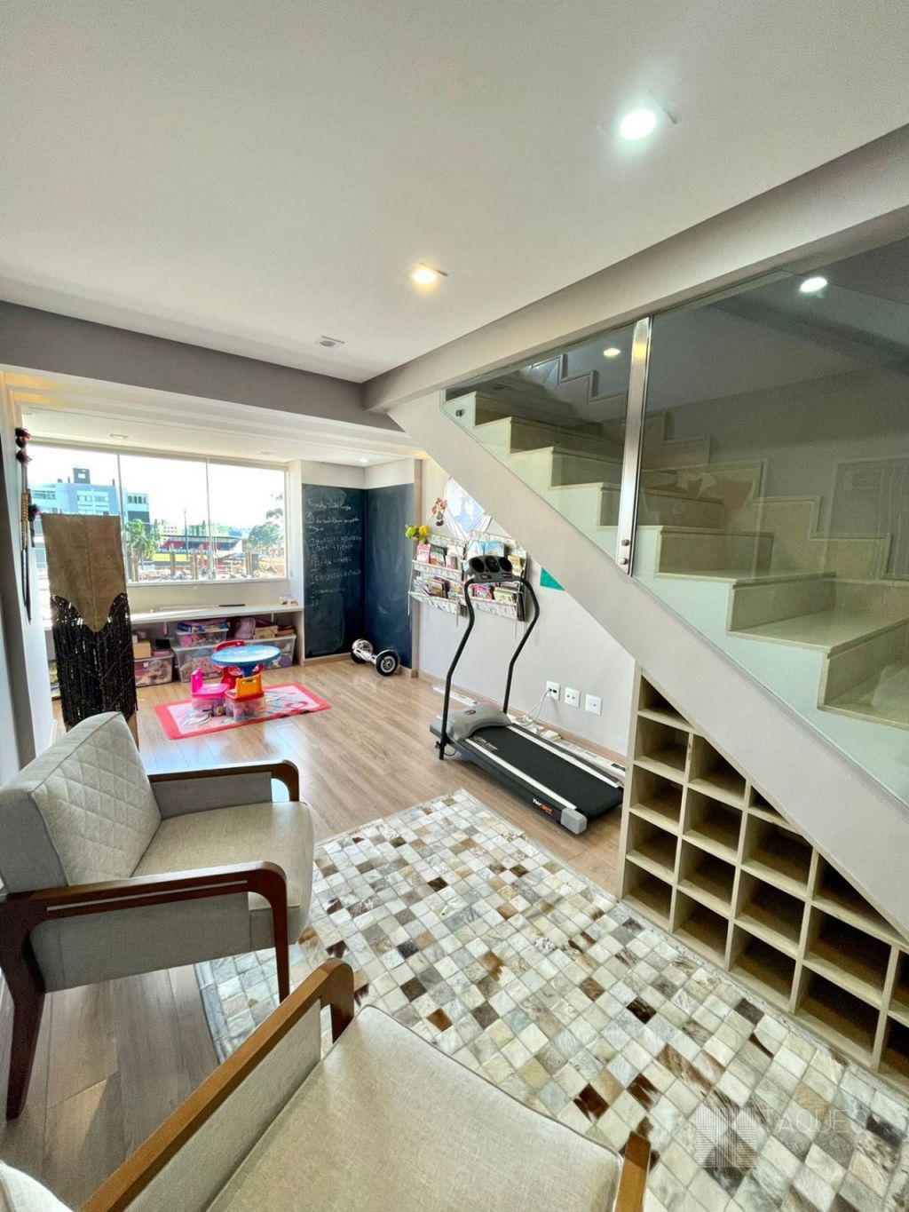 Imóvel duplex, contendo na parte inferior três suítes ( sendo uma master com closet), todos com armários planejados de fino acabamento. Ainda no mesmo piso temos um espaço living-room, onde pode ser utilizado como escritório ou brinquedoteca.