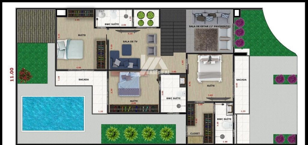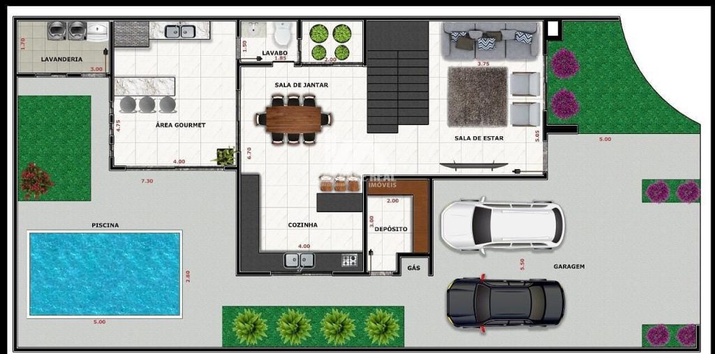 Garagem para 2 Carros, Depósito, Sala de Estar, Cozinha e Sala de Jantar, Espaço Gourmet, Lavanderia, Jardim Descoberto, Piscina, Sala de TV, sacadas, Terraço com captação de Água da chuva.