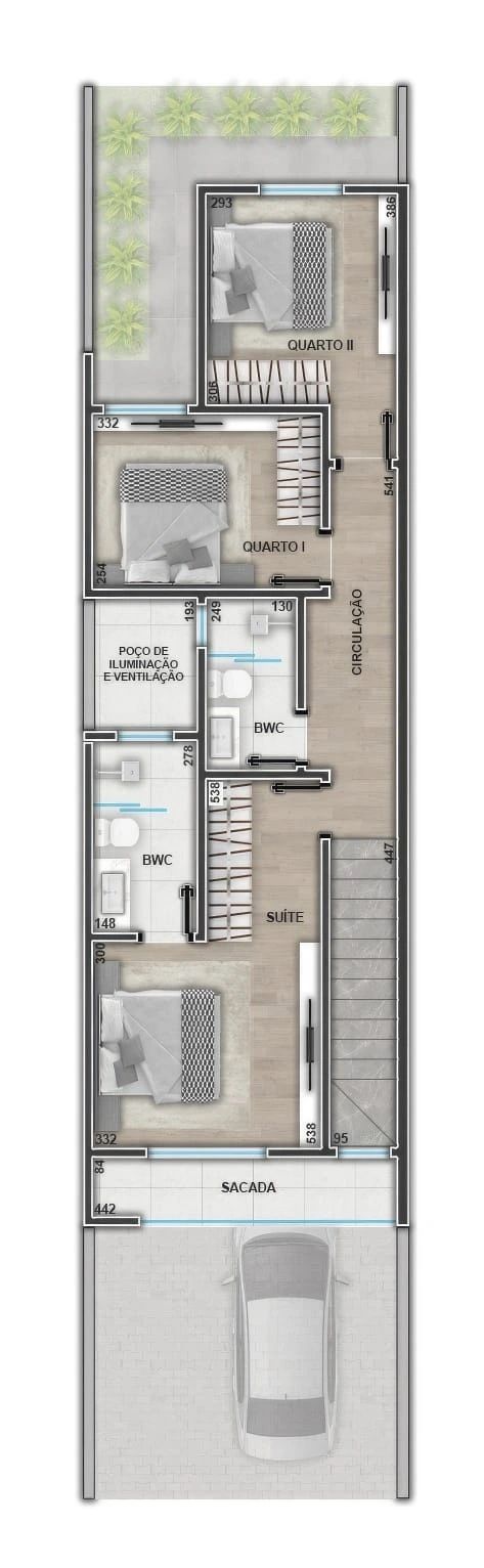Além de todo esse espaço de área construída, o sobrado ainda conta com 11m² de sobra de tereno na frente e 8m² de terreno no fundo.