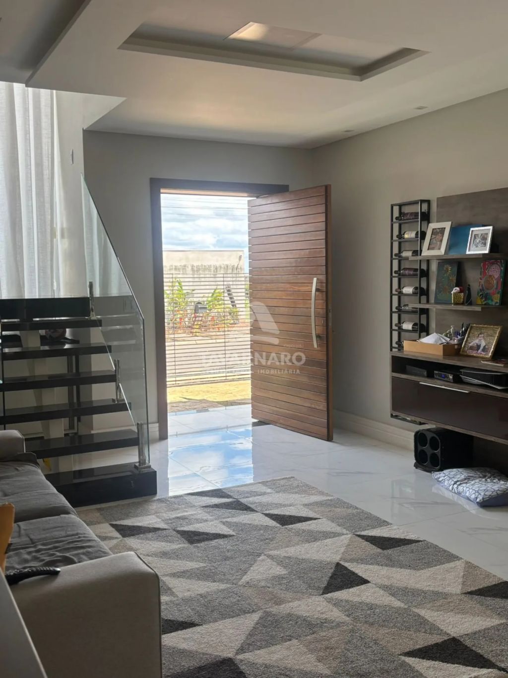 Sala de estar ampla e bem iluminada, com piso de alta qualidade.
