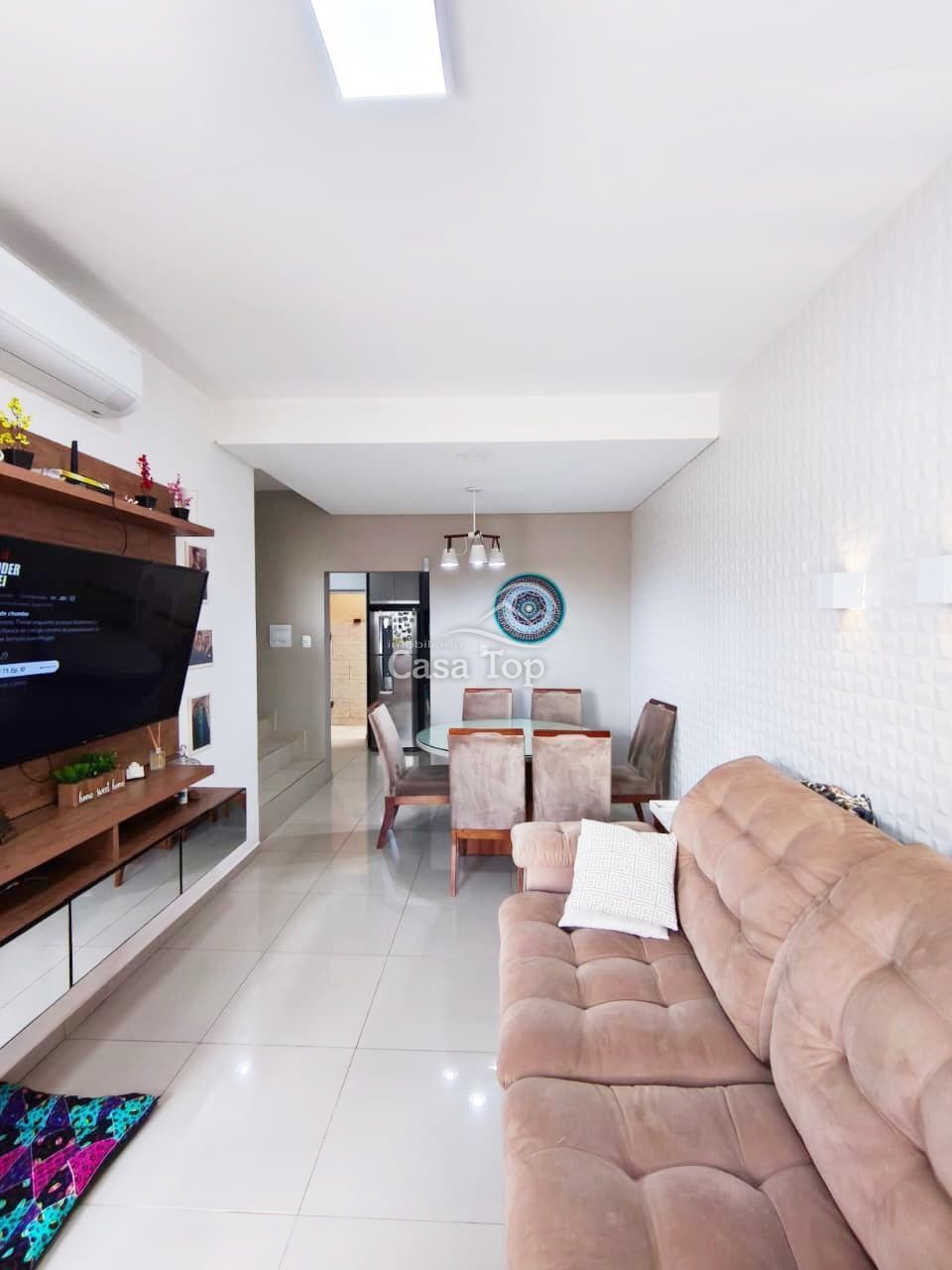 Sobrado semimobiliado medindo aprox. 109m², contendo 3 quartos (sendo 1 suíte), sala para 2 ambientes, cozinha, área de serviço coberta, lavabo, BWC social e garagem.