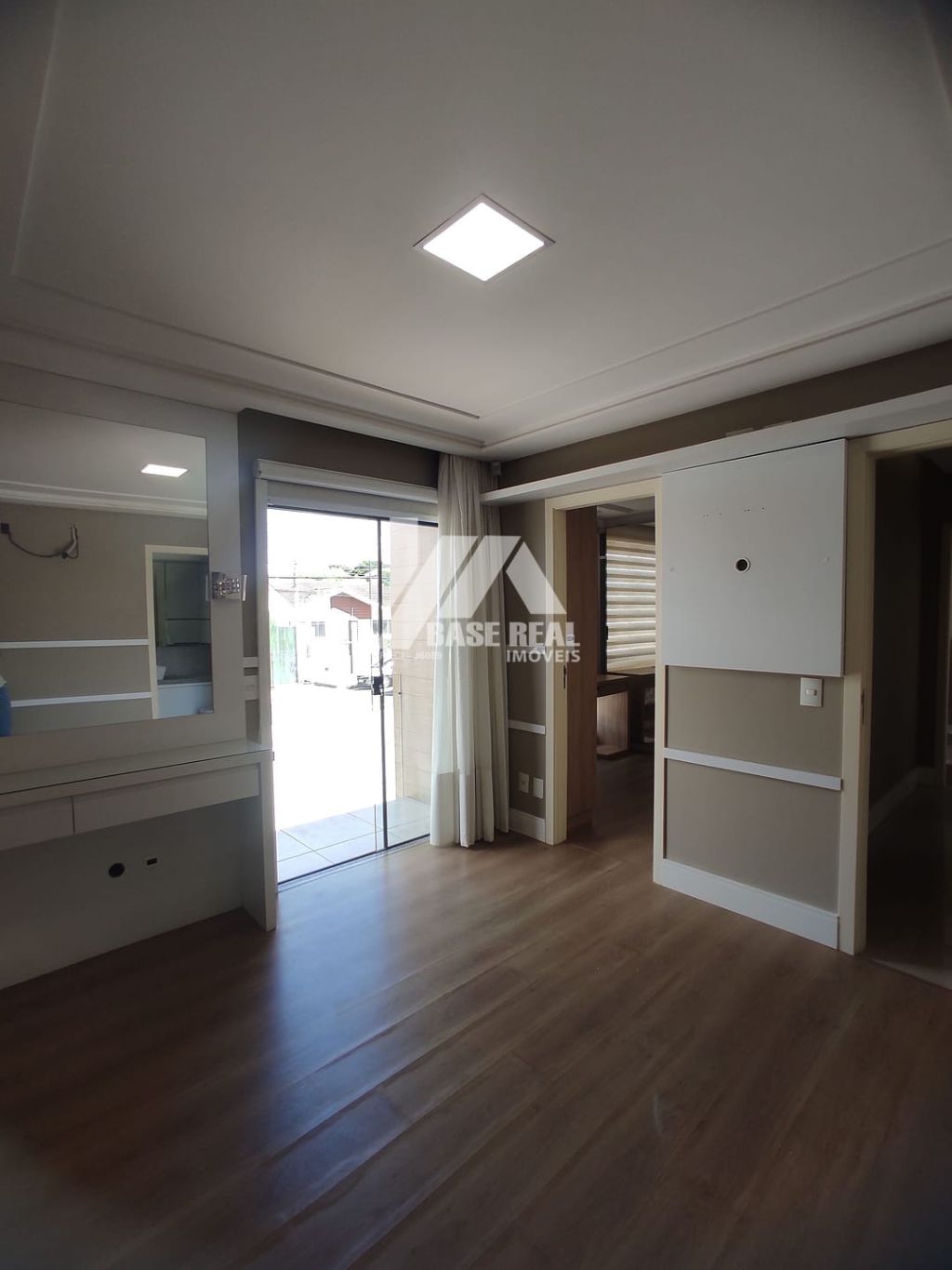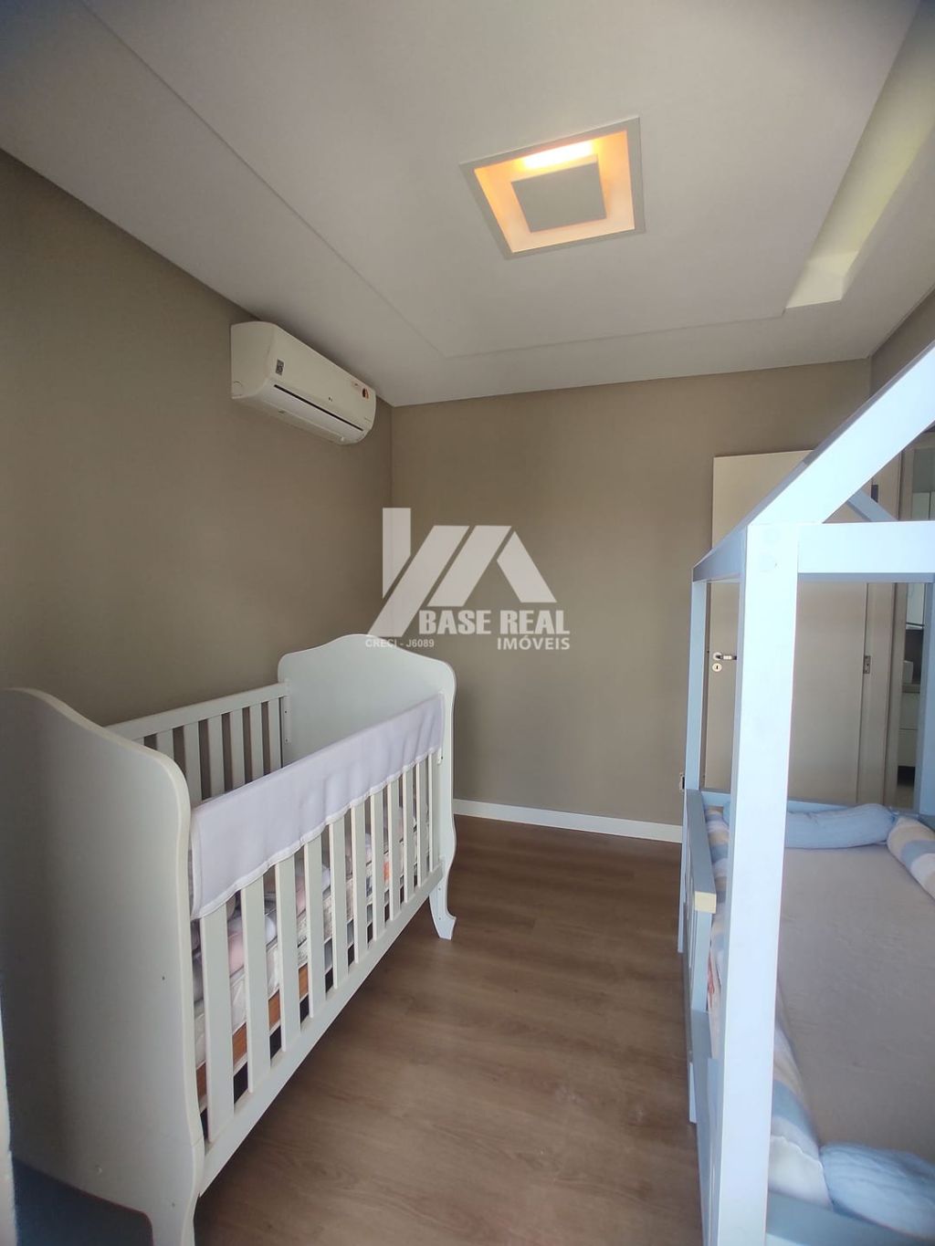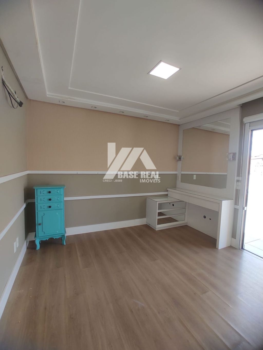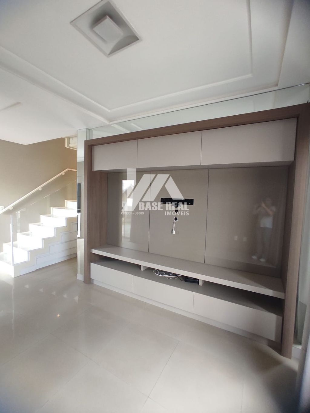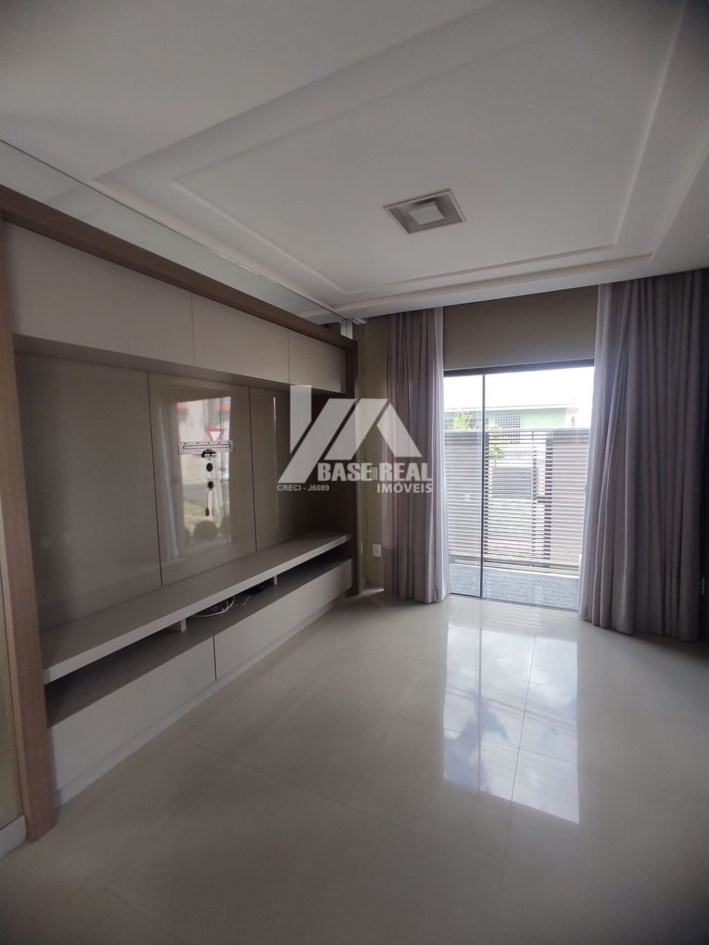 Sala de estar com painel de tv, e preparação para ar condicionado.