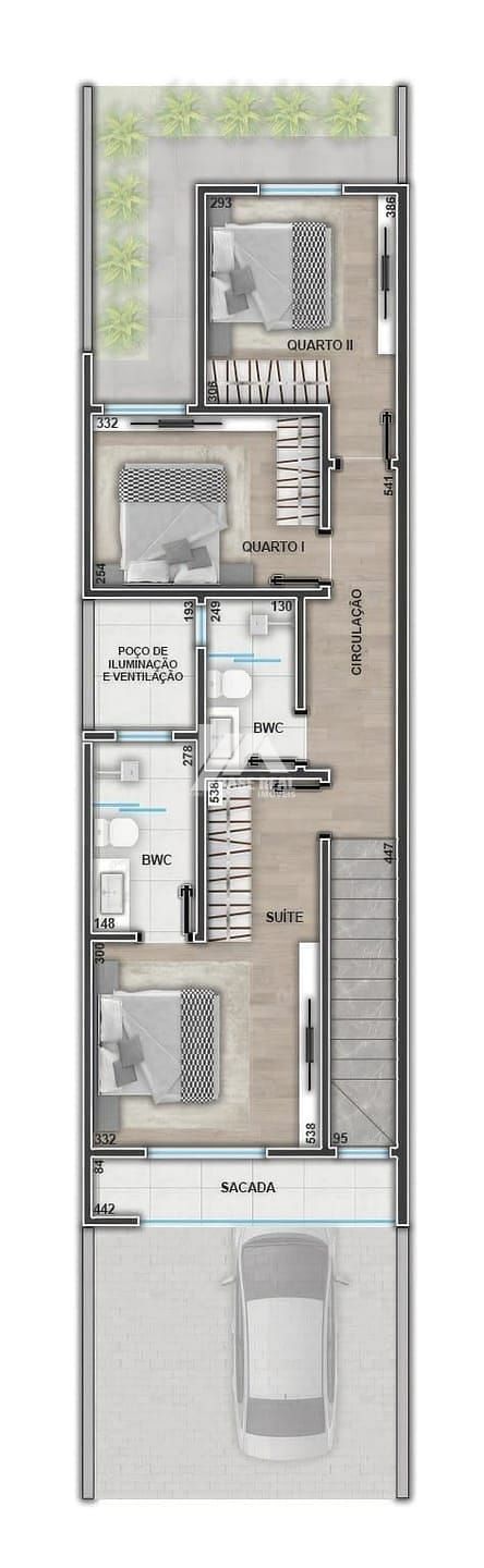 O piso superior possui 3 quartos, sendo 1 suíte, além de banheiro social e uma sacada ampla que garante ótima ventilação e iluminação natural.