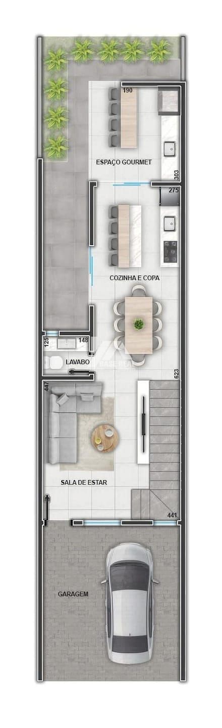 No piso térreo, dispõe de sala ampla, lavabo, copa integrada, cozinha funcional, espaço gourmet individual com churrasqueira e lavanderia coberta, proporcionando praticidade no dia a dia e excelente ambiente para receber.